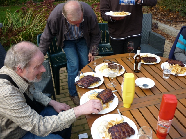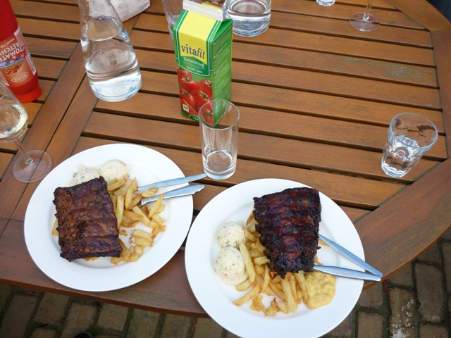 In een stralend zonnetje op het buitenterras lieten Paul, Nel en hun kinderen ons genieten van dampende schalen met Spare Ribs en frieten. Een mooie afsluiting van een goed bestede dag.