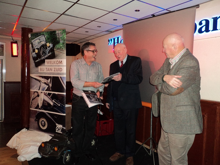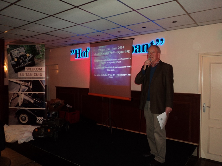 Gedurende de receptie is HET boekje uitgereikt, zijn de bestuurswijzigingen en het boeiende programma voor het komende jaar gepresenteerd. Daarnaast werd onze scheidend penningmeester in het zonnetje gezet.Om een uur of 2 werd de recepte geopend door onze voorzitter. Hij heette iedereen welkom in het bijzonder onze oud leden die speciaal waren uitgenodigd. Deze receptie gaf ons een mooie gelegenheid om ons boekje ‘TAN-Zuid 40 jaar’ te presenteren. De eerste exemplaren werden aan de gebroeders vd Boom, de oprichters van TAN-Zuid, uitgereikt door Marjon Delvaux en Henk Maas. (zie artikel "Jubileumboekje" hoe je dit kunt bestellen). Ook werd de nieuwe banner van TAN-Zuid gepresenteerd welke vanaf nu onze leden welkom zal heten bij de komende evenementen. Daarna was het tijd aan de verschillende organisatoren van de evenementen voor 2014. Te beginnen met Paul Zomers die ons direct enthousiast wist te maken voor de voorjaarsrit (6 april 2014) welke in West-Brabant zal plaats vinden. Middels een boeiende presentatie gaf hij ons al een inkijk wat ons te wachten staat. Hierna was het de beurt aan Paul Officier die ons een presentatie voorschotelde over het ‘TAN 50 jaar’ feest (29 mei t/m 1 juni 2014) wat landelijk op Hemelvaart aan het organiseren is. Voor de mensen die wat low-budget de Hemelvaart willen doorbrengen werd er nog stil gestaan bij het initiatief van de familie Maas en Helbers om de Hemelvaart met de Franse tractionclub in het kader van ‘Traction 80 jaar’ door te brengen in Noord Frankrijk. Uiteraard werd het aspergeweekend (21 en 22 juni 2014) nog eens vermeld om af te sluiten met een korte presentatie van de voorzitter van de BOCC met Rolf vd Zande en mijzelf over de najaar rit / verbroederingsrit met de BOCC (19 oktober 2014) welke op de grens van België en Nederland in het midden van Brabant zal worden gehouden waarbij we ernaar streven om dit een BOCC – TAN-Zuid coproductie te laten zijn waardoor u kunt gaan genieten van vele Tractions met Belgische platen. Ook werd er kort stilgestaan bij de financiële verantwoording van 2013 door de penningmeester. Deze werd hierna uitvoerig toegesproken door de voorzitter omdat hij na 11 jaar als bestuurslid, secretaris, penningmeester en vicevoorzitter nu afscheid nam van het bestuurlijke circuit.