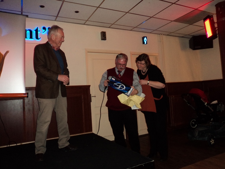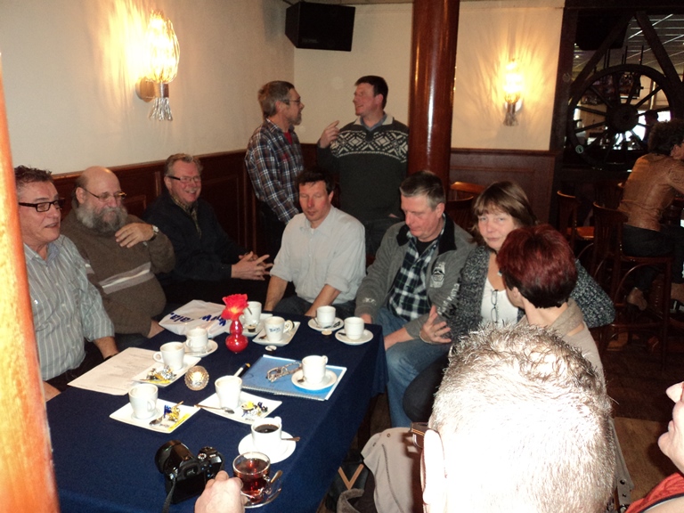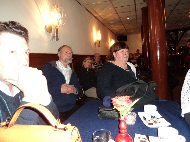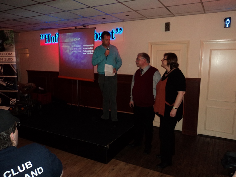 Gedurende de receptie is HET boekje uitgereikt, zijn de bestuurswijzigingen en het boeiende programma voor het komende jaar gepresenteerd. Daarnaast werd onze scheidend penningmeester in het zonnetje gezet.Om een uur of 2 werd de recepte geopend door onze voorzitter. Hij heette iedereen welkom in het bijzonder onze oud leden die speciaal waren uitgenodigd. Deze receptie gaf ons een mooie gelegenheid om ons boekje ‘TAN-Zuid 40 jaar’ te presenteren. De eerste exemplaren werden aan de gebroeders vd Boom, de oprichters van TAN-Zuid, uitgereikt door Marjon Delvaux en Henk Maas. (zie artikel "Jubileumboekje" hoe je dit kunt bestellen). Ook werd de nieuwe banner van TAN-Zuid gepresenteerd welke vanaf nu onze leden welkom zal heten bij de komende evenementen. Daarna was het tijd aan de verschillende organisatoren van de evenementen voor 2014. Te beginnen met Paul Zomers die ons direct enthousiast wist te maken voor de voorjaarsrit (6 april 2014) welke in West-Brabant zal plaats vinden. Middels een boeiende presentatie gaf hij ons al een inkijk wat ons te wachten staat. Hierna was het de beurt aan Paul Officier die ons een presentatie voorschotelde over het ‘TAN 50 jaar’ feest (29 mei t/m 1 juni 2014) wat landelijk op Hemelvaart aan het organiseren is. Voor de mensen die wat low-budget de Hemelvaart willen doorbrengen werd er nog stil gestaan bij het initiatief van de familie Maas en Helbers om de Hemelvaart met de Franse tractionclub in het kader van ‘Traction 80 jaar’ door te brengen in Noord Frankrijk. Uiteraard werd het aspergeweekend (21 en 22 juni 2014) nog eens vermeld om af te sluiten met een korte presentatie van de voorzitter van de BOCC met Rolf vd Zande en mijzelf over de najaar rit / verbroederingsrit met de BOCC (19 oktober 2014) welke op de grens van België en Nederland in het midden van Brabant zal worden gehouden waarbij we ernaar streven om dit een BOCC – TAN-Zuid coproductie te laten zijn waardoor u kunt gaan genieten van vele Tractions met Belgische platen. Ook werd er kort stilgestaan bij de financiële verantwoording van 2013 door de penningmeester. Deze werd hierna uitvoerig toegesproken door de voorzitter omdat hij na 11 jaar als bestuurslid, secretaris, penningmeester en vicevoorzitter nu afscheid nam van het bestuurlijke circuit.