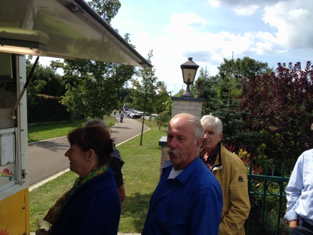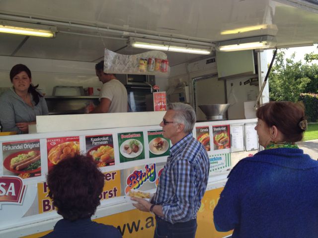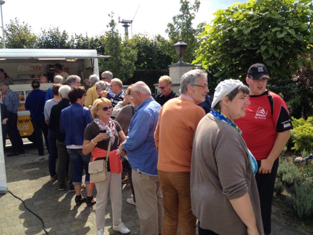 Tja en als we dan toch in België zijn dacht Paul, laten we dan ook maar een traditionele lunch aanbieden. Dus stond er een mobiele frietkraam bij zijn huis op ons te wachten. Al snel stonden we rustig in de rij te keuvelen in afwachting van de fritten en wat daarbij hoort. We mochten zelfs nog een keer halen, maar de porties waren zo genereus dat dat niet nodig was! Als klap op de vuurpijl kwam ook de ijsboer langs, waarbij een bolletje gelijk stond aan 2 Hollandse bolletjes ijs…