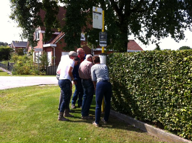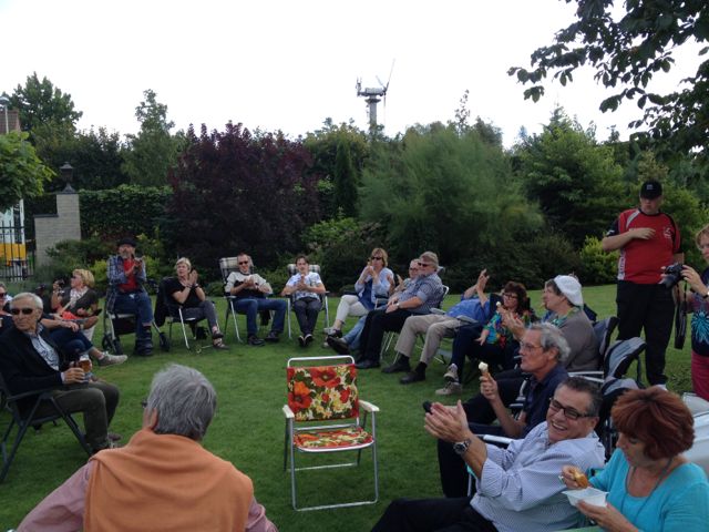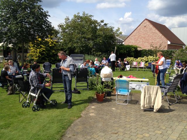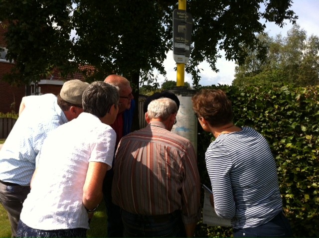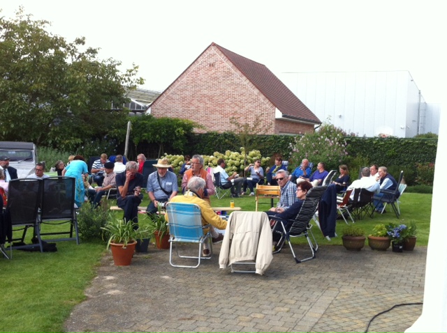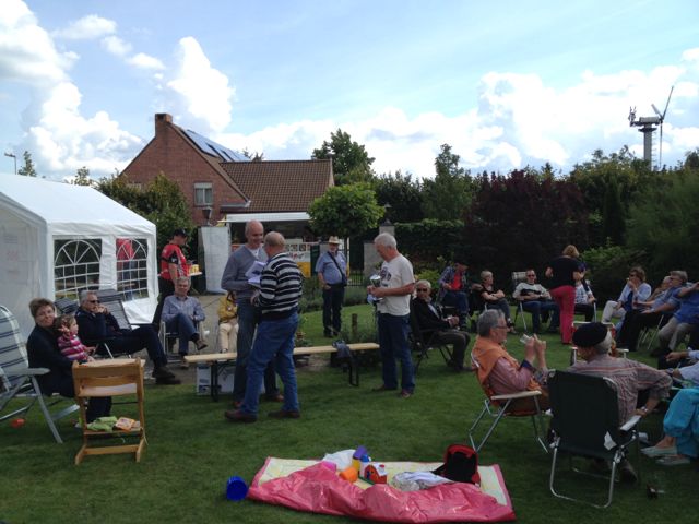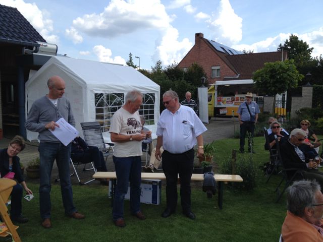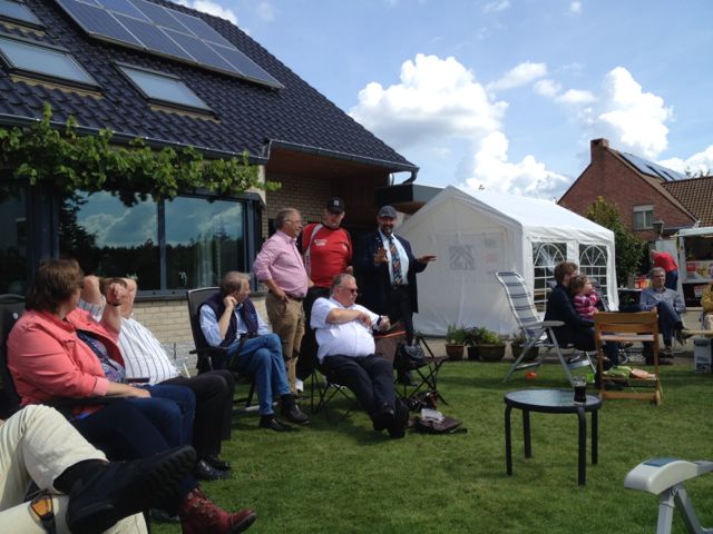We lieten de partytent voor wat het was en gingen lekker aan de koffie met verse vlaai in een grote kring in de tuin zitten. Na de ontvangst kregen we van Gaston en Marion Delvaux een route uitgereikt met fotopuzzel. Vorig jaar was de zogenaamde TANZuid Wisselbokaal geïntroduceerd. Dit jaar werd dus wederom gestreden om deze trofee.