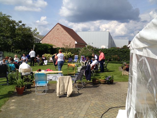 Na zoveel zon, kwam er een aardig buitje aan, dus snel werd plan getrokken om het partnerprogramma te starten. Dit was of een bezoek aan het glasmuseum in Lommel, of een korte wandeling naar een enorm tuincentrum vlakbij. De rest van het gezelschap spoedde zich naar de tent om daar de ledenvergadering van Zuid te houden.