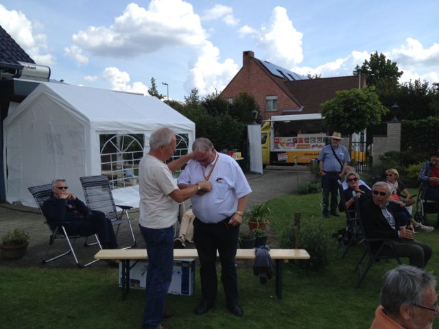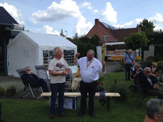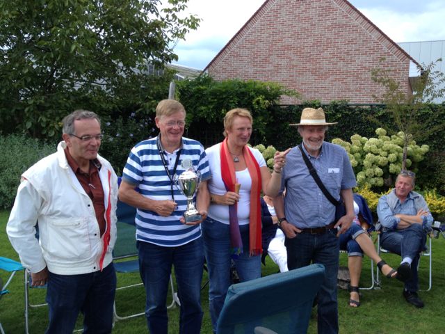 Terwijl wij aan de patatten zaten was Gaston druk bezig met het verwerken van de fotopuzzel antwoorden. Zo moesten we onderweg antwoord geven op de hoeveelheid bier die onze zuiderbuur jaarlijks drinkt, of waar de meeste chocola wordt gegeten, en nog veel meer vragen waar je niet zo maar het antwoord op weet. Voordat de winnaar van dit jaar bekend werd gemaakt, ontving Geert van Eijk nog een eremetaal als aandenken aan de trofee van 2013. De winnaar van 2014 was de equipe Julius Schilthuis en Anke-Nel Vos daarbij geassisteerd door Rene Methorst en Peter Dingen.
