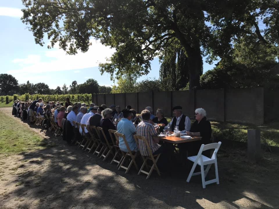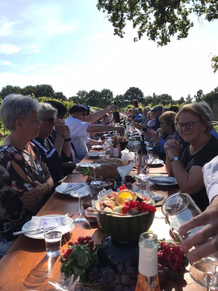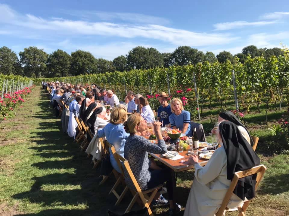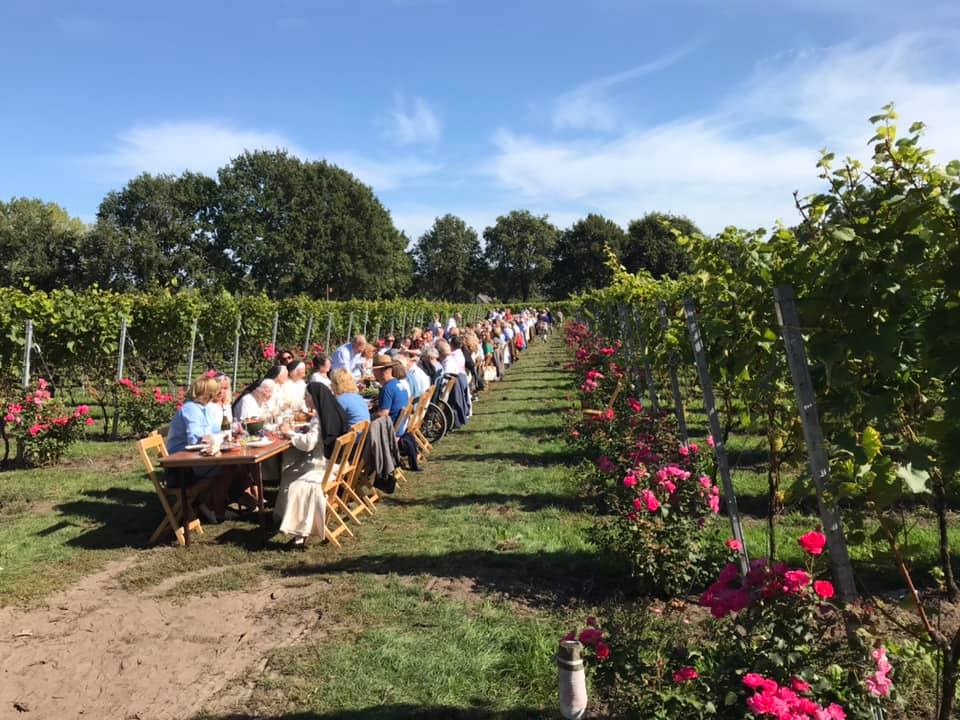 Vervolgens mochten wij aanschuiven aan lange tafels welke in de wijngaard opgesteld waren. Door alle gebeden van de zusters bleef het weer werkelijk voortreffelijk en we hebben genoten van al het lekkers wat ons voorgeschoteld werd.