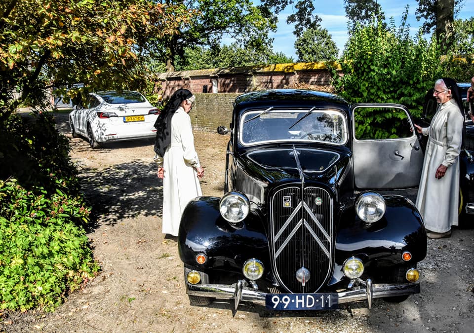 Na afloop bleek dat de zusters toch ook wel geïnteresseerd waren in techniek want de Tractions werden nauwkeurig bestudeerd wat er in resulteerde dat Henk Maas met vrijwel alle zusters een rondritje gemaakt heeft. Wat zich precies heeft afgespeeld tijdens deze rondritjes zullen we nooit weten, maar alle zusters kwamen blozend en giechelend de Traction weer uit……….