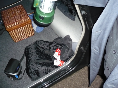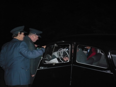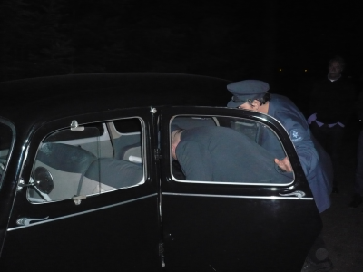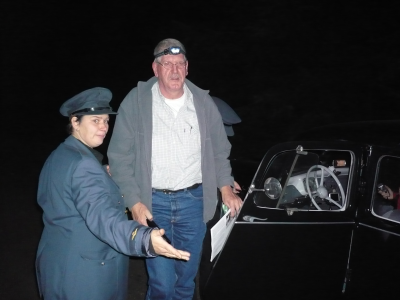Bij de start werd ook nog aangegeven dat 3 auto's - willekeurig aangewezen - smokkelwaar mee zouden krijgen. Zij kregen de opdracht om deze koste wat het kost veilig naar het eindpunt te brengen. Eenmaal onderweg reden we over kleine weggetjes van Breda via Hoogstraten en Baarle Nassau naar het eindpunt - restaurant De Klok in Reusel. Maar.... wij hadden natuurlijk een hold-up voor jullie georganiseerd. Weliswaar niet met politie en zwaailichten, maar wel met de echte boswachter. Dus stond er op een verlaten weg ineens een opsporingsambtenaar met spiegelei de tractions en eenden aan te houden. Mag ik uw papieren zien meneer, wat is het doel van uw reis etc. waren de vragen die we doortastend op ons af kregen gevuurd. Had je de boswachter gehad, dan kwam je meteen in de armen van twee ' douaniers' te weten Frank en Francis Kok. Zij hadden zich met hun oude legertruck verdekt opgesteld en hielden steekproefsgewijs een onderzoek in de auto. Op bijgaande foto's ziet u Huib en Helma de Bruine die dachten slim te zijn en als laatste er tussendoor te piepen. Maar onze controleurs waren onverbiddelijk en vonden dan ook de nodige smokkelwaar op de achterbank!!