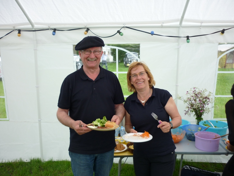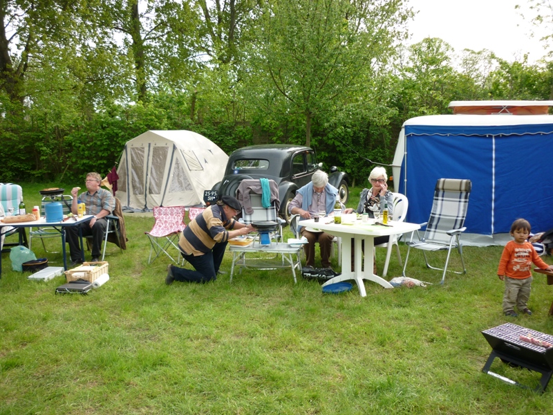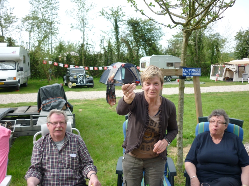 Nadat iedereen bij de super of slager BBQ ingrediënten had aangeschaft , gingen om 16:30u de kooltjes aan en om 17:00u de bar open (salade plus). De geuren lokten andere campinggasten die vol bewondering onze voitures bekeken. De pers was niet van ons terrein weg te slaan, en wij zijn benieuwd wat er in de media gaat verschijnen. Plotseling, tussen twee lamskoteletten door, werd een bezoekend artiest aangekondigd en wel Andrea Boccelli. Hij bracht zo’n succesnummer/act dat tot vele malen bis bis werd geroepen. Wat een zangtalent binnen onze club. Het was een droge BBQ tot middernacht. Een regenbui gaf een wat geforceerd einde aan een geslaagde BBQ.