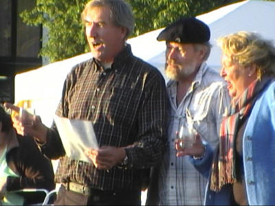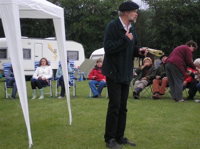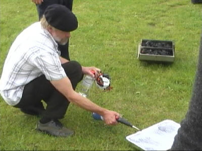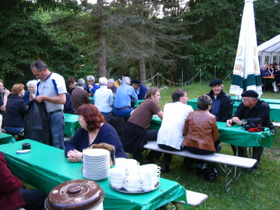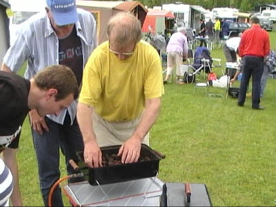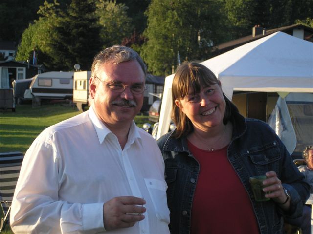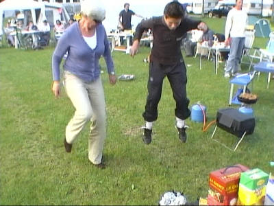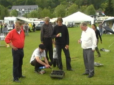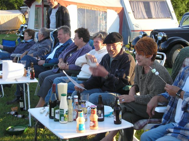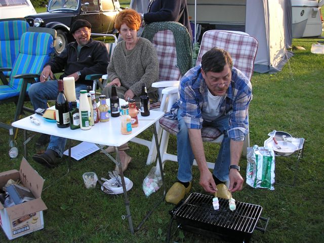Het weer was ook zaterdag prima en zonnig. Dus gingen de meegebrachte BBQ's 's avonds professioneel in de hens. De aanwezige brandweerman - onze Henk - kon niet verhinderen dat sommigen enthousiast olie op hun hete kolen gooiden. Ook echte erfstukken onder de BBQ's moesten met hulp van de sleutelploeg weer op gang worden gebracht. Als grote verrassing liet Jan Uylings nog een feestlied aanrukken voor Geert en Leontien van Eijk die onlangs 12,5 jaar getrouwd waren. In het Neder-Russisch werd het Glasnivolski lied aangeheven. Het was nog lang na zonsondergang gezellig in de kring daar op het grasveld.