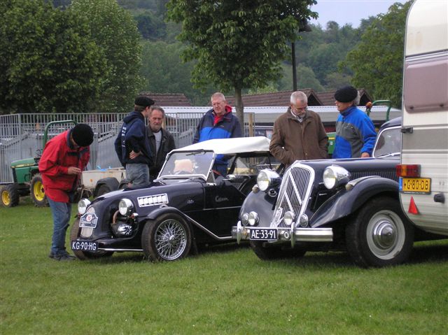 De volgende ochtend was het eerst wat nevelig, maar toen we om half elf in kolonne de camping verlieten voor de rondrit brak de zon goed door. Rob en Daan hadden een prachtige tocht uitgezet waarbij we alle kleine en leuke weggetjes in de buurt hebben bereden. Grappig en een mooie combinatie was ook de Patron van Wim en Marianne van Duren en de gele HY bus van Erwin Kulsdom die achter de Traxen aanreden. We hadden zodoende de nodige bekijks van de locale bevolking.