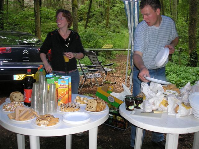 De omgeving van Diekirch en Echternach is erg heuvelachtig dus afstand houden en op tijd terug schakelen was het advies van de organisatoren. Ergens midden in het bos stond er ineens een lekkere picknick klaar. Compleet met broodjes, drinken en tafels om aan te zitten. Daan en Thomas (en aanhang) hadden die morgen al flink wat werk verzet om alles aan te slepen. Perfect jongens!