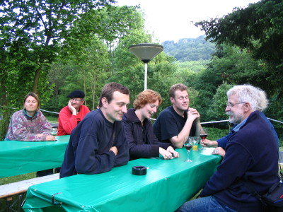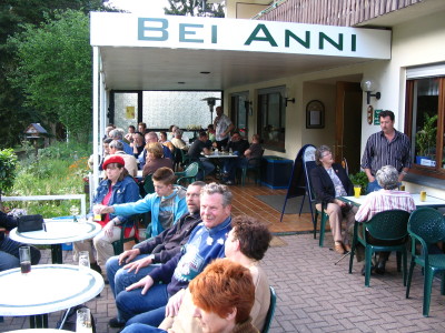 Vol goede moed tuften we door naar Echternach waar we op de markt de auto's neerzetten. Even werden we nog terechtgewezen op het parkeerverbod door een driftig gebarend heerschap, hetgeen uiteindelijk de burgemeester bleek te zijn. "Nur fünf minuten hier für die Foto's" uit de mond van Rob deden hem lijdzaam toezien en verder lopen. Op de diverse terrassen werd een verkwikkend biertje gedronken waarna de stoet zich verder richtte op het eindpunt. Dat bevond zich net over de grens met Duitsland in een bierlokaal met de toepasselijke naam 'Bei Anni'. Anni zelf regelde de bediening met gezwinde spoed en sprintte door haar biertuin met 70 grote lappen schnitzel. Tot ons grote vermaak demonstreerde ze ook nog eens hoe je een glas Duits bier in een keer leegdrinkt! Haar sprintkwaliteiten liepen daardoor wel iets terug was onze indruk.