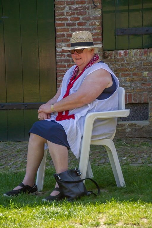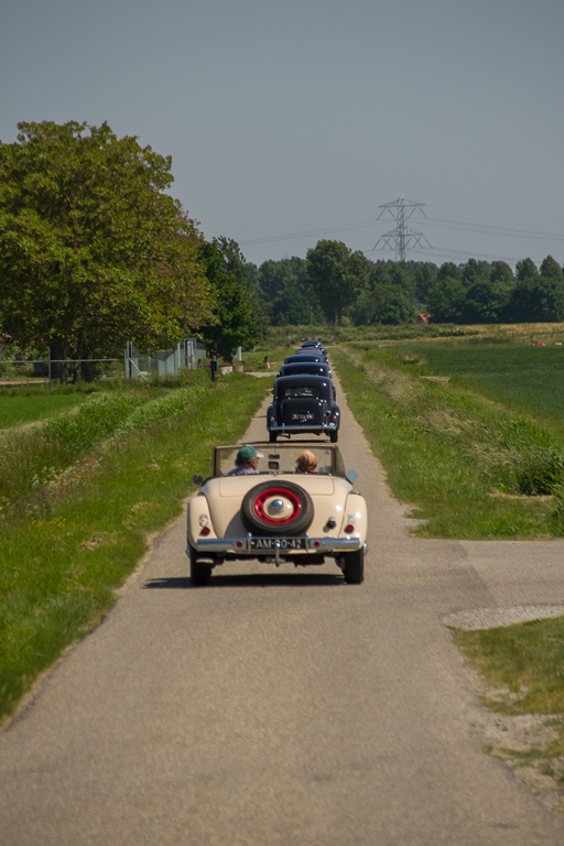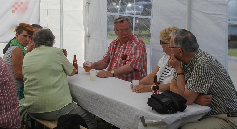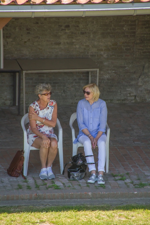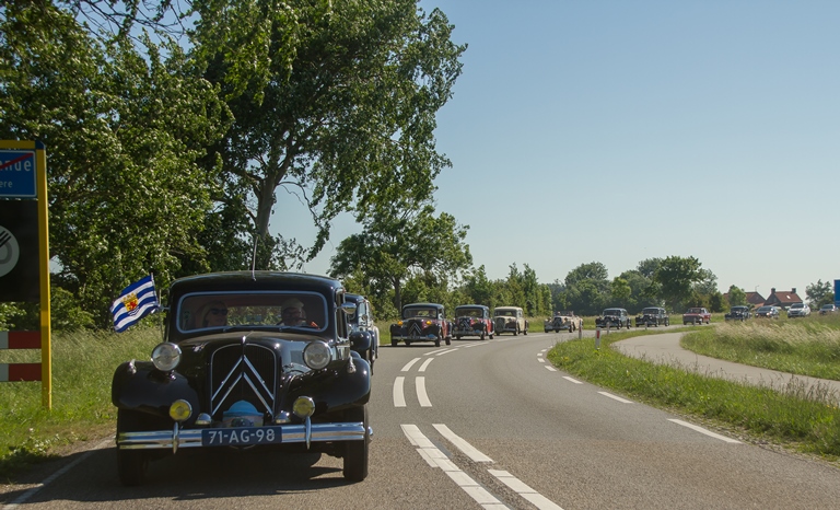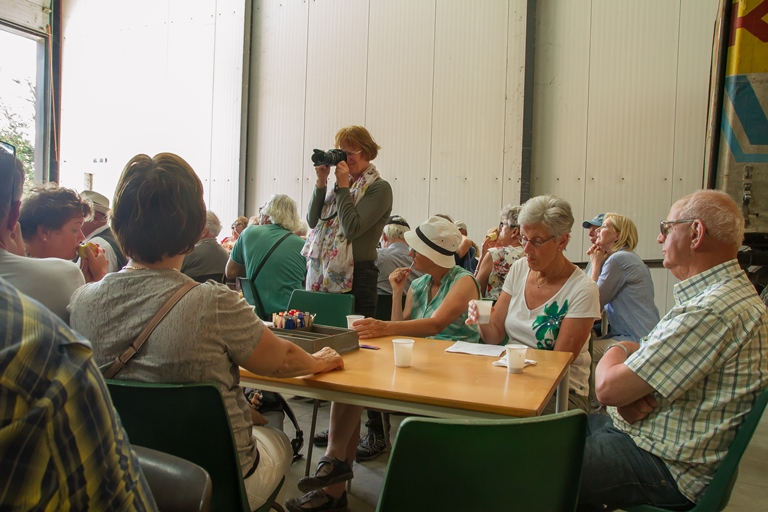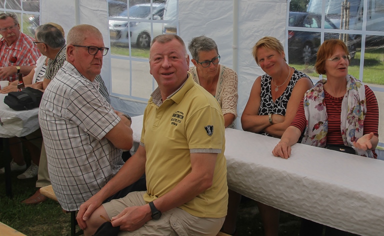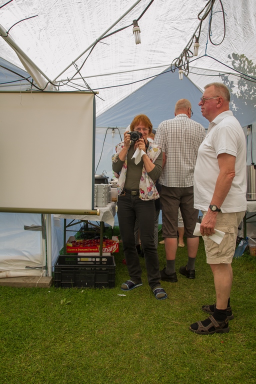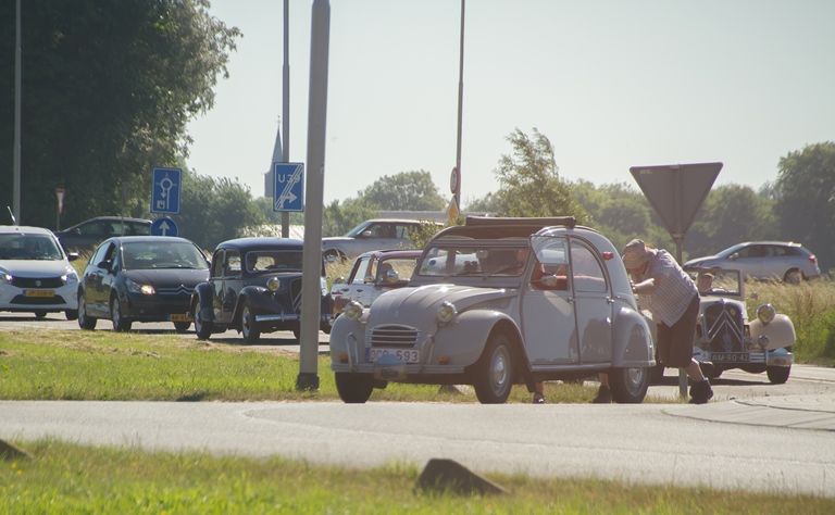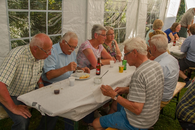 De militaire betekenis, de fases in het geschiedkundige verloop, de diverse bestemmingen, die het fort kreeg tot aan de 2e wereldoorlog, het uitzicht op de Schelde maakte toch diepe indruk op de traxionisten. Met deze indrukken vertrokken we en masse naar de middagstop. Inmiddels haakte enkele leden aan die deze rit ook wilde meemaken en zo de sfeer bij onze afdeling wilde proeven. Fam. Vermue- een van de organisatoren van het weekend – heeft in het mooie landschap nabij de kerncentrale van Borsele een groot fruitteelt bedrijf. Langs dijken, weggetjes wist de stoet prachtige tractions hun bedrijf te vinden. Plaats genoeg voor de traxen en een heuse voorraadschuur was door hen omgetoverd tot een heerlijk koele lunchplek. Deze ambiance en de verzorging met drie keuzes soep, gesmeerde broodjes en koffie en thee verhoogde alleen maar de stemming onder de rijders. Na wat veel gekeuvel onder elkaar en de sanitaire verplichtingen vertrokken de reislustigen voor het tweede gedeelte van de rit richting Middelburg. Ik begreep dat velen de auto – mede door de hitte – lekker in een koele parkeergarage neergezet hebben en er een stadwandeling van gemaakt hebben. De terug keer naar de camping is zeer divers uitgevoerd.