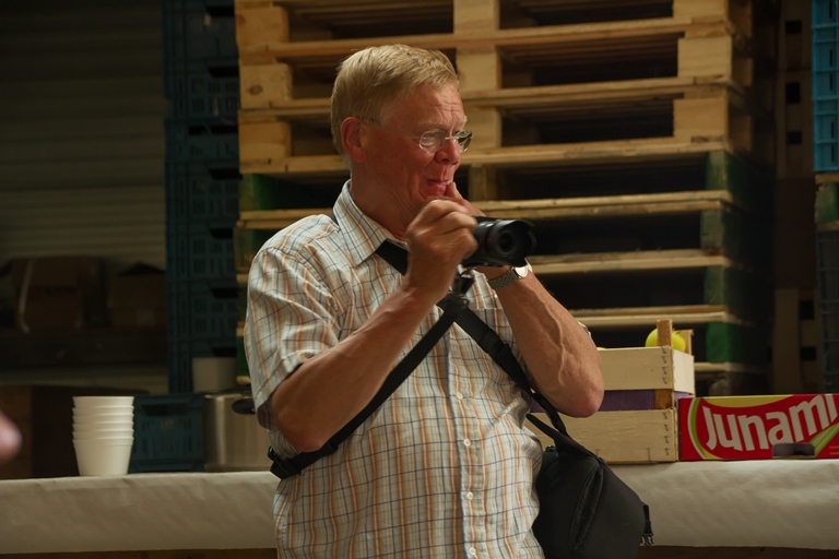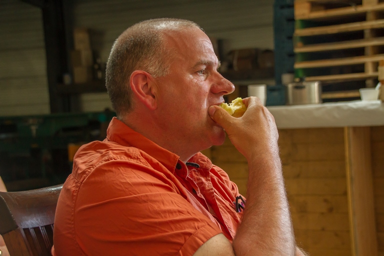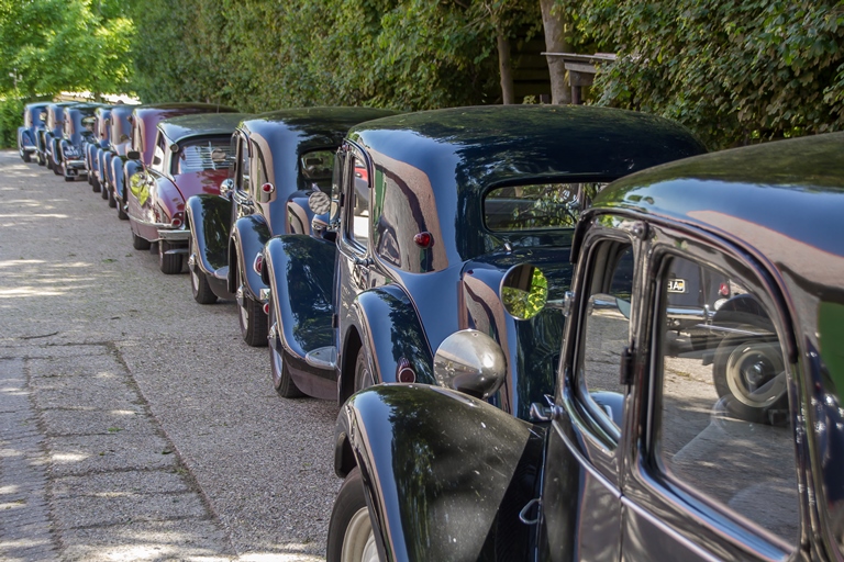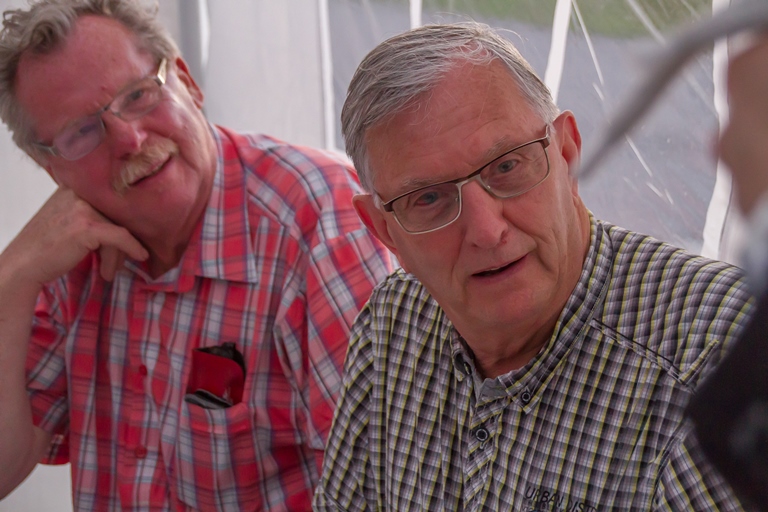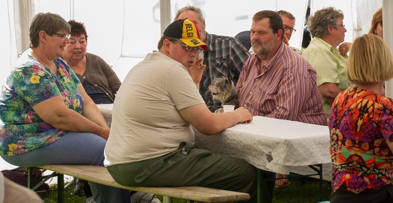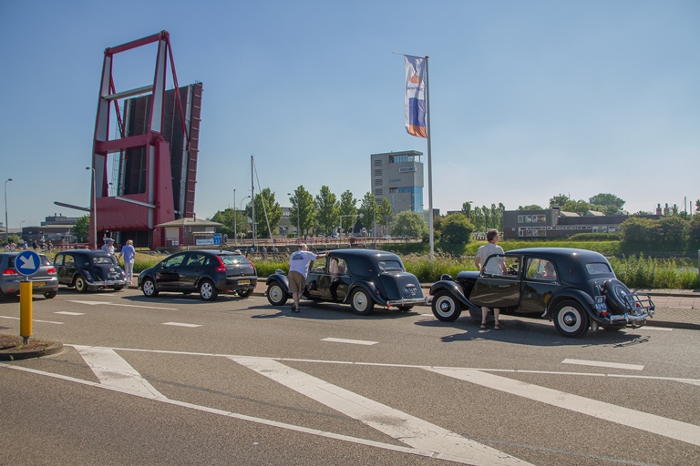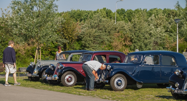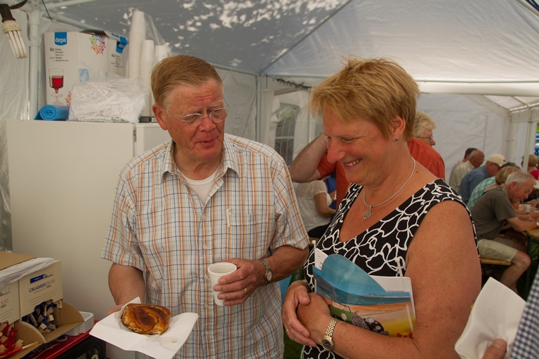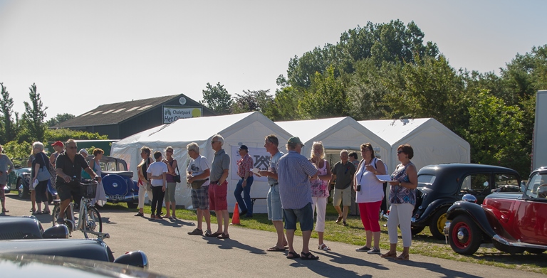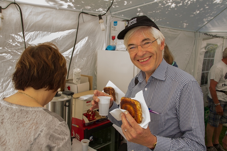 De militaire betekenis, de fases in het geschiedkundige verloop, de diverse bestemmingen, die het fort kreeg tot aan de 2e wereldoorlog, het uitzicht op de Schelde maakte toch diepe indruk op de traxionisten. Met deze indrukken vertrokken we en masse naar de middagstop. Inmiddels haakte enkele leden aan die deze rit ook wilde meemaken en zo de sfeer bij onze afdeling wilde proeven. Fam. Vermue- een van de organisatoren van het weekend – heeft in het mooie landschap nabij de kerncentrale van Borsele een groot fruitteelt bedrijf. Langs dijken, weggetjes wist de stoet prachtige tractions hun bedrijf te vinden. Plaats genoeg voor de traxen en een heuse voorraadschuur was door hen omgetoverd tot een heerlijk koele lunchplek. Deze ambiance en de verzorging met drie keuzes soep, gesmeerde broodjes en koffie en thee verhoogde alleen maar de stemming onder de rijders. Na wat veel gekeuvel onder elkaar en de sanitaire verplichtingen vertrokken de reislustigen voor het tweede gedeelte van de rit richting Middelburg. Ik begreep dat velen de auto – mede door de hitte – lekker in een koele parkeergarage neergezet hebben en er een stadwandeling van gemaakt hebben. De terug keer naar de camping is zeer divers uitgevoerd.