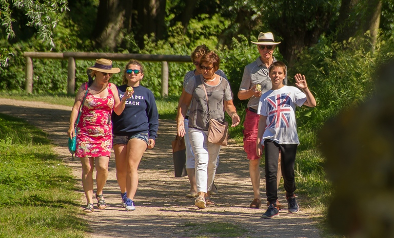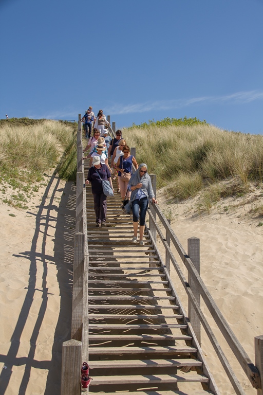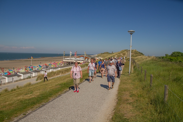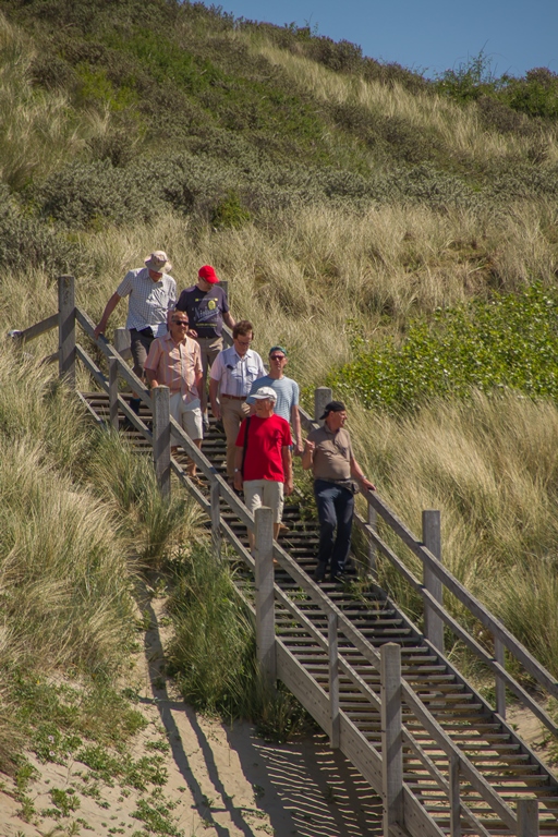 Ook nu weer werd op creatieve wijze gebroken met de traditionele en facultatieve ochtendwandeling door de organisatie. Legendarisch is de verwondering van Tina Looff : “Waarom s ’morgens op een lege maag en veel te vroeg achter een boswachter aansjokken om uiteindelijk, uitgehongerd en doodvermoeiend op een ontbijt tafel te storten? Dat moet bij ons in Zeeland anders kunnen!”. En het ging ook anders. Uitgeslapen en na een goed ontbijt vertrok het grootste deel met traction om 09.45 uur naar Zoutelande om daar op een immens grote parkeerplaats onze hobby achter te laten en te starten met een mooie wandeling over het hoge duintop van ca 1,5 kilometer. Doel was een bezoek aan het bunkermuseum , waar onder leiding van een tweetal gidsen tekst en uitleg werd gegeven over de werkwijze en samenhang van de Zeeuwse bunkers als onderdeel van de zg Atlantic Wall. Het moet Zeeuwse humor zijn om precies tegenover deze bunkers een nieuw appartementencomplex voor Duitse Toeristen te bouwen om uit te kijken op hun eigen Erfgoed….!