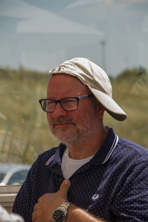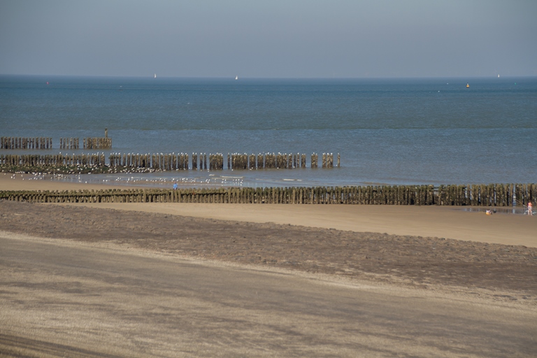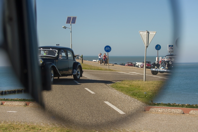 Rond 10 uur zaten daar de terrassen al vol- aan de koffie neem ik aan – en al snel reden we parallel aan de duinen richting Westkapelle. De route leidde ons over de duinen en via de geasfalteerde zeewering kregen we langdurig ruim blik op de zee. Witte scheepjes en in de verte een windmolenpark gaf de weidsheid aan van dit natuur element. Het blijft prachtig en verveelt nooit.