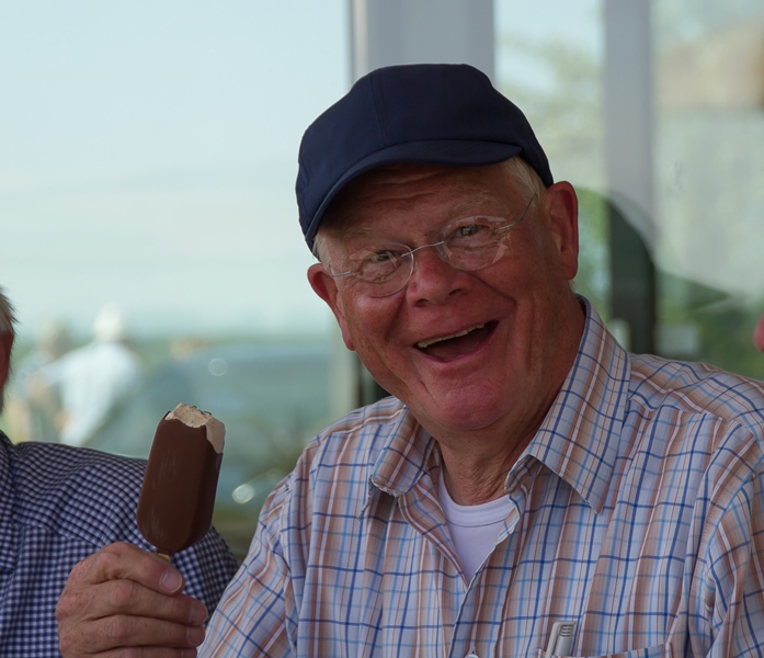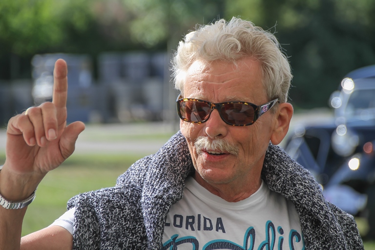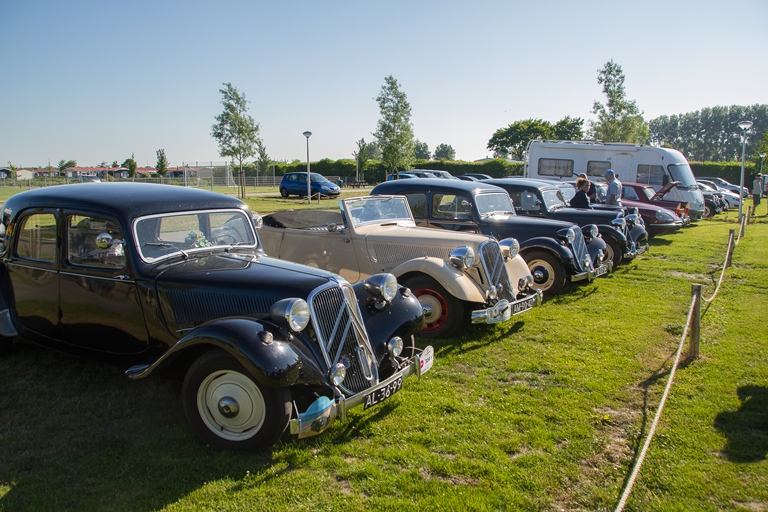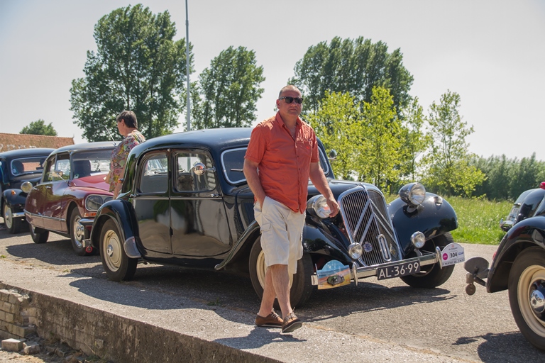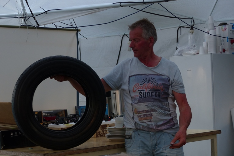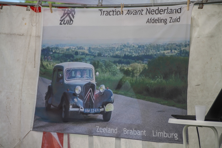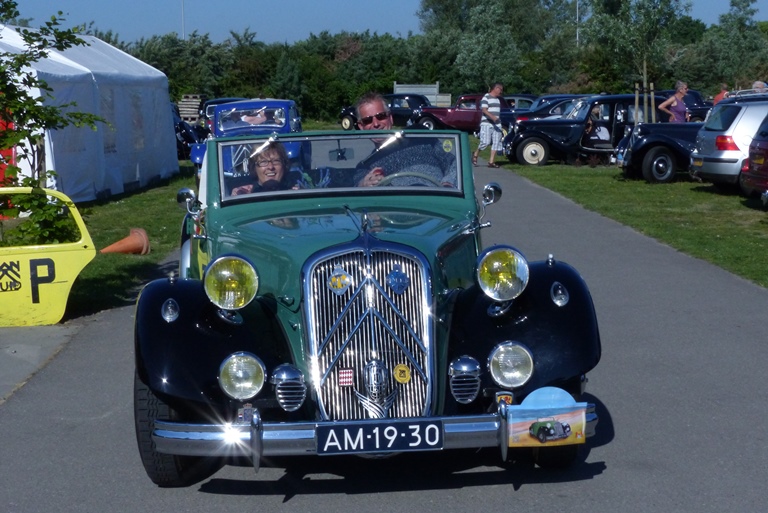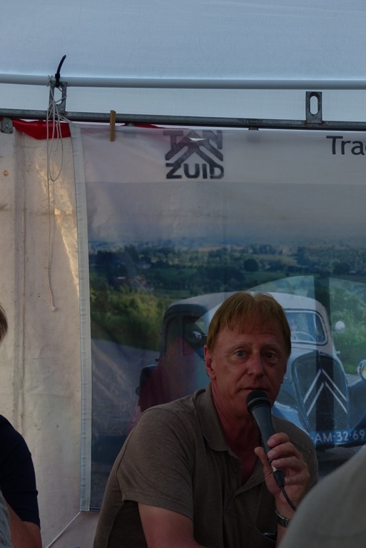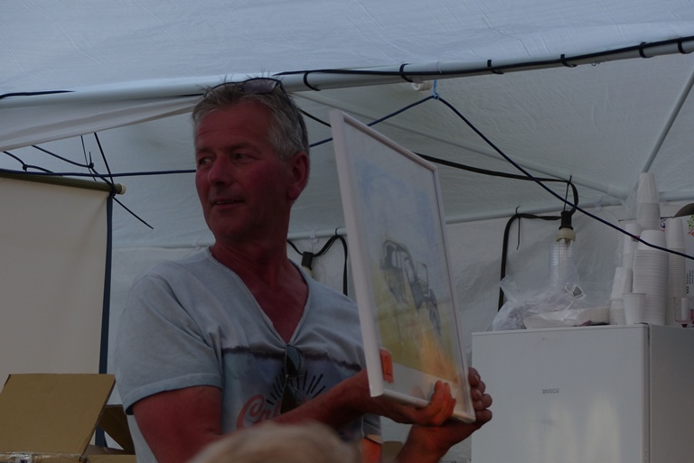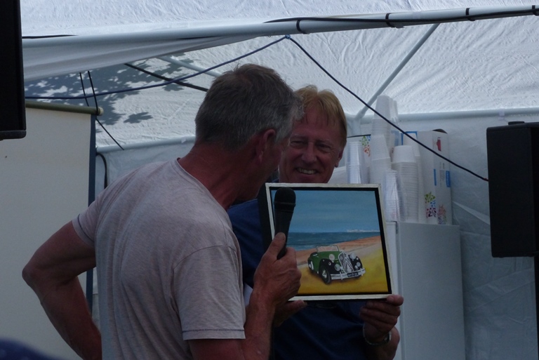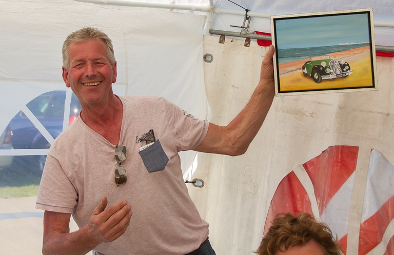 Groot nieuws was direct daarop volgend de aankondiging dat Johan die dag jarig was. Luid zingen was, in de grote TAN Zuid tent, onze bijdrage. Veel groter was de verrassing van het schitterende cadeau , een prachtig schilderij, gemaakt door Nelly, afbeeldend de bekende Traction cabrio van Johan, in de juiste groene kleur, op het strand van Walcheren. Daarna ontvingen wij ons auto schildje….absoluut het mooiste auto schildje wat TAN Zuid ooit heeft vervaardigd….een replica van dit schilderij!!!!