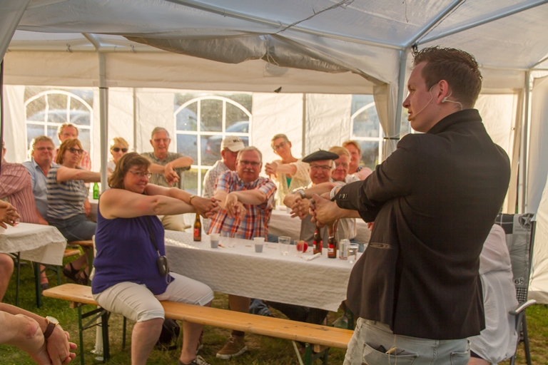 Na dit overvloedige buffet werden we vergast en bij de neus genomen door het optreden van de goochelaar…en plain publique , maar ook aan ieders tafel konden we ons schamen dat we absoluut niet begrepen waarom wij de goocheltruc niet konden doorgronden. Absoluut hoogtepunt was het slotnummer. Het verdwijnen van de goochelaar in een grote ballon, onbeschrijfelijk deze voorstelling…daar moest je gewoon bij zijn!
