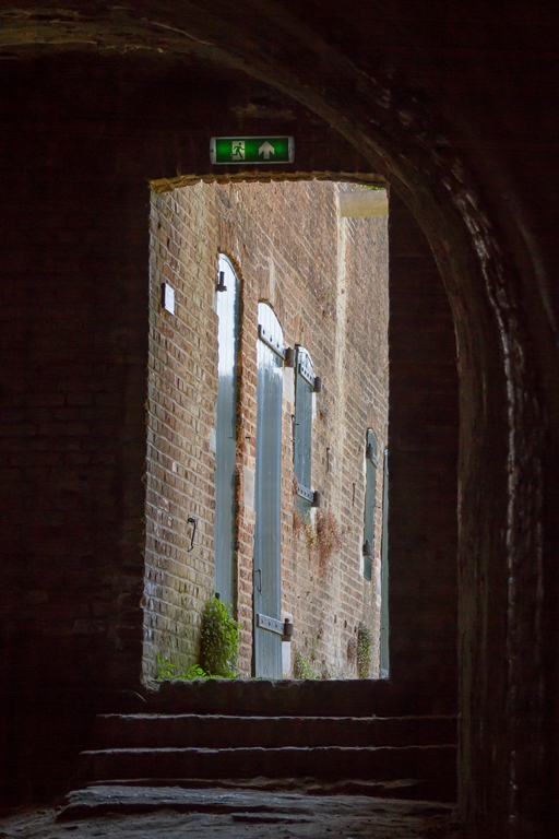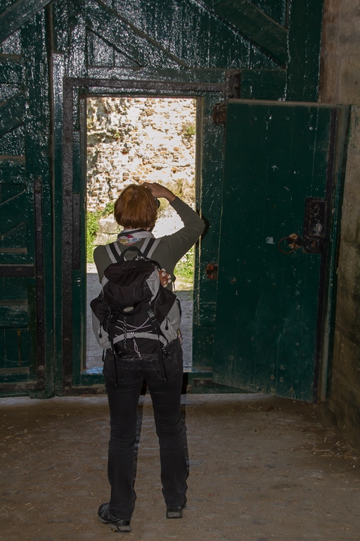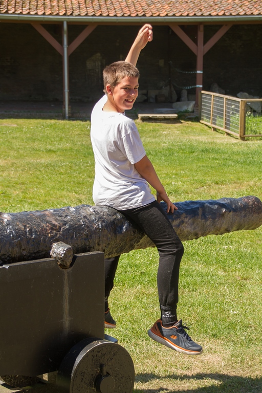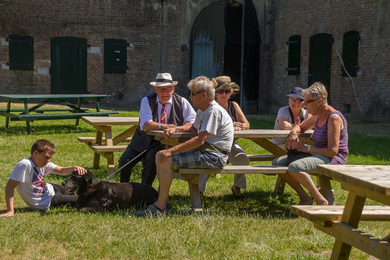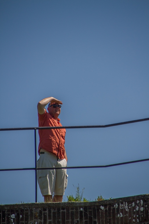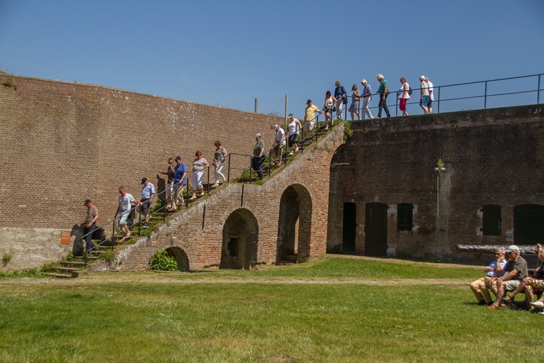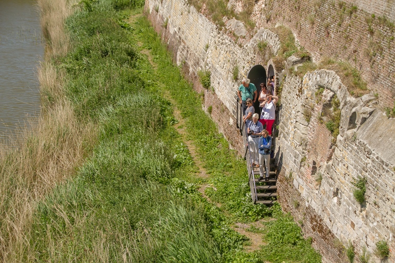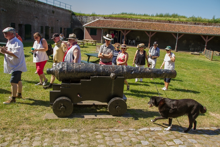 Overigens al veel bekijks onderweg. Via Westkapelle een omweg genomen om Zoutelande (gaan we de volgende dag bezoeken) heen langs de duinweg naar Dishoek, Westduin naar de Boulevard van Vlissingen. Met een rustig rijtempo (max 30 km) kun je genieten van het uitzicht, de schepen en de toeristen. De kop van de boulevard met het standbeeld van de Ruijter en de in en uitvarende loodsboten, de zeeschepen…. Het blijft fascineren. Na deze fotostop door de stad Vlissingen richting Ritthem naar het fort Rammekens. Voor de meesten een onbekend punt in de roemruchte geschiedenis van Walcheren. De auto’s netjes geparkeerd op de zeedijk en een korte wandeling naar de karakteristieke poort, aan de hand van een Italiaanse bouwmeester met een verschrikkelijk moeilijke naam! We werden in twee groepen gesplitst en konden zo het ontstaan, geschiedenis en verval van dit enorme zeefort (enigste in Europa) van een gids vernemen. Rijkswaterstaat heeft dit in beheer!