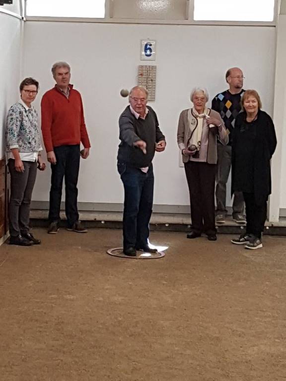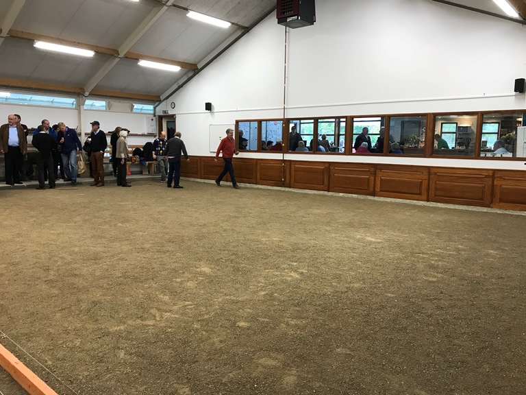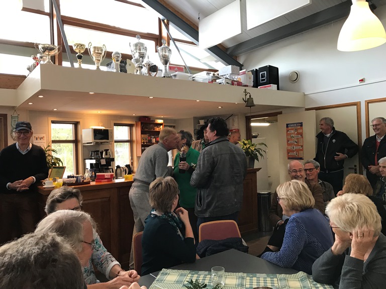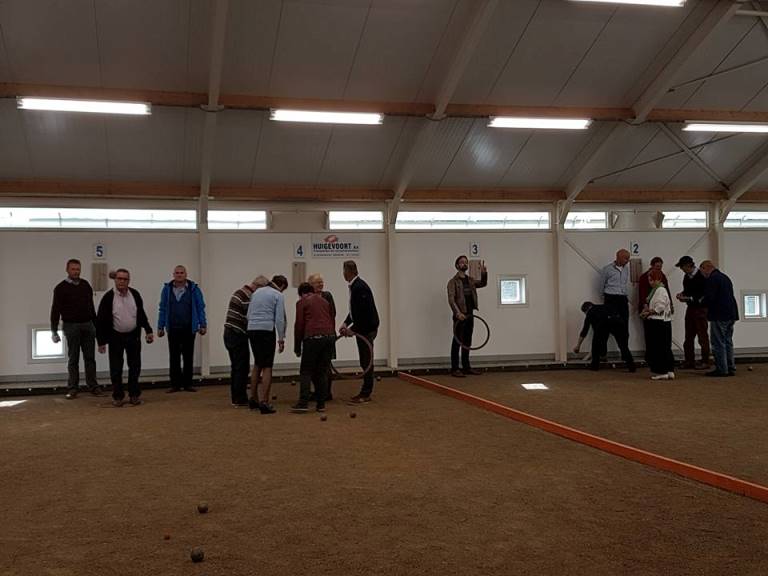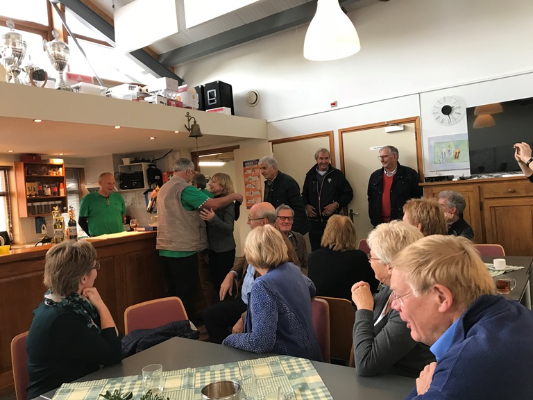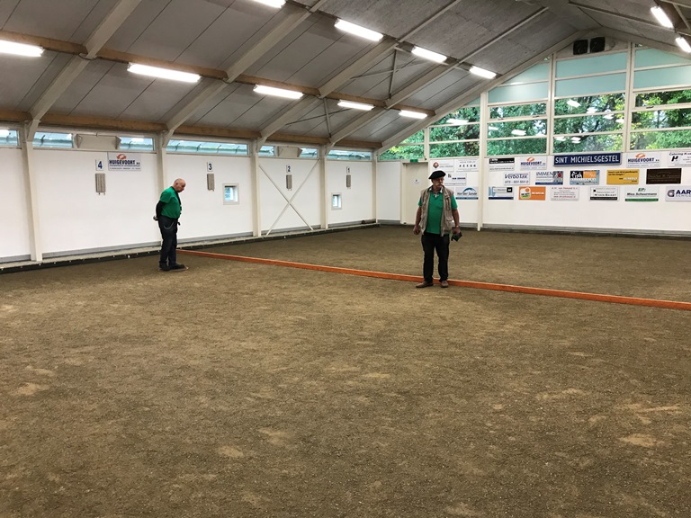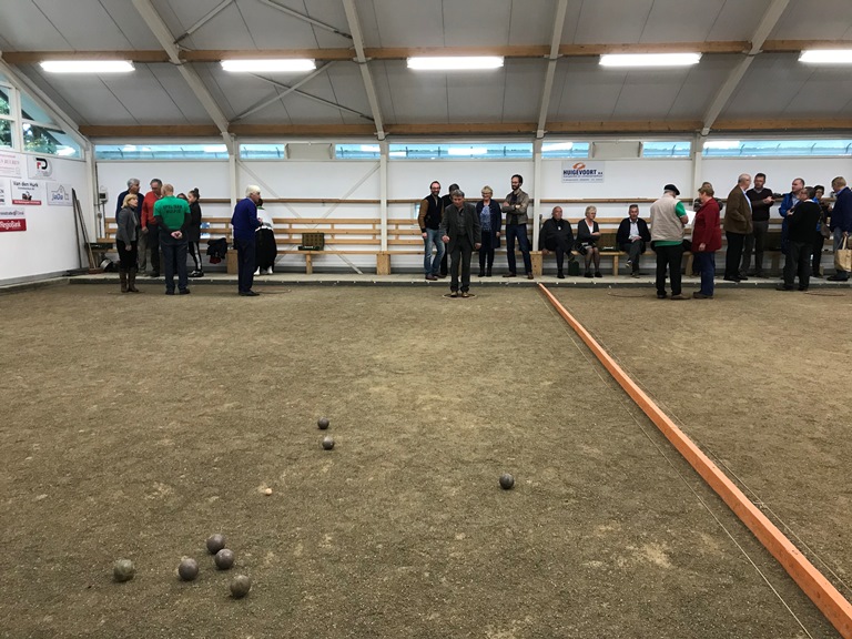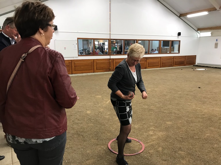 De voorspelling van Jan Uijlings dat we een mooie route zouden volgen, werd zeker niet gelogenstraft. Zelfs de vele Brabanders die deelnamen, kwamen in ook voor hen onbekende dreven en weggetjes. Zoals later ook werd gememoreerd, was het een leuke bijkomstigheid van het weer dat we weinig last hadden van wandelaars en fietsers op de weg. Uiteindelijk kwamen we aan bij ’t Dupke in Sint Michelsgestel, waar een sportieve tussenstop was gepland. Onder leiding van de organisatie, letterlijk en figuurlijk met de franse slag, werd iedereen naar de mooie, ruime overdekt petanquebanen gedirigeerd. Een leuke manier om met andere deelnemers samen gezellig bezig te zijn. En zowaar er waren ook nog deelnemers die dankzij hun partners gewonnen hadden en die mochten een collectors item, een fles wijn met ’t Dupke etiket in ontvangst nemen tijdens een enigszins chaotische maar zeker geen onplezierige prijsuitreiking.