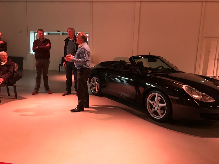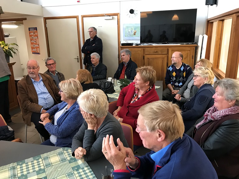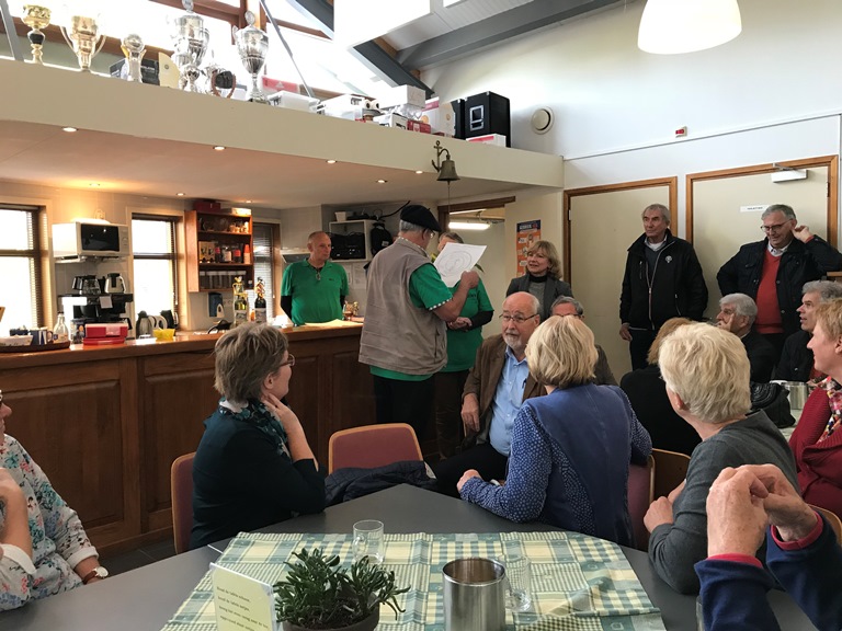 Daar wij ingecalculeerd hadden dat we zouden starten met een kopje koffie en/of thee, veronderstelden wij, ten onrechte bleek, dat de inloop een half uur voor het vermelde startmoment op de uitnodiging zou plaatsvinden. Wij mochten dan ook als een van de eersten de route, bonnetjes en het Schild voor op de Traction in ontvangst nemen. Daardoor waren we natuurlijk wel in de gelegenheid alle deelnemers, leden van de club ZUID, bij binnenkomst te monsteren. En wij konden constateren dat het wel goed zit met de onderlinge relaties binnen de club. Stoelen werden af en aan gesjouwd om gezellig bij elkaar bij te kletsen en ik hoorde, als volslagen leek, al snel allerlei termen uit het autovakjargon over en weer gaan.