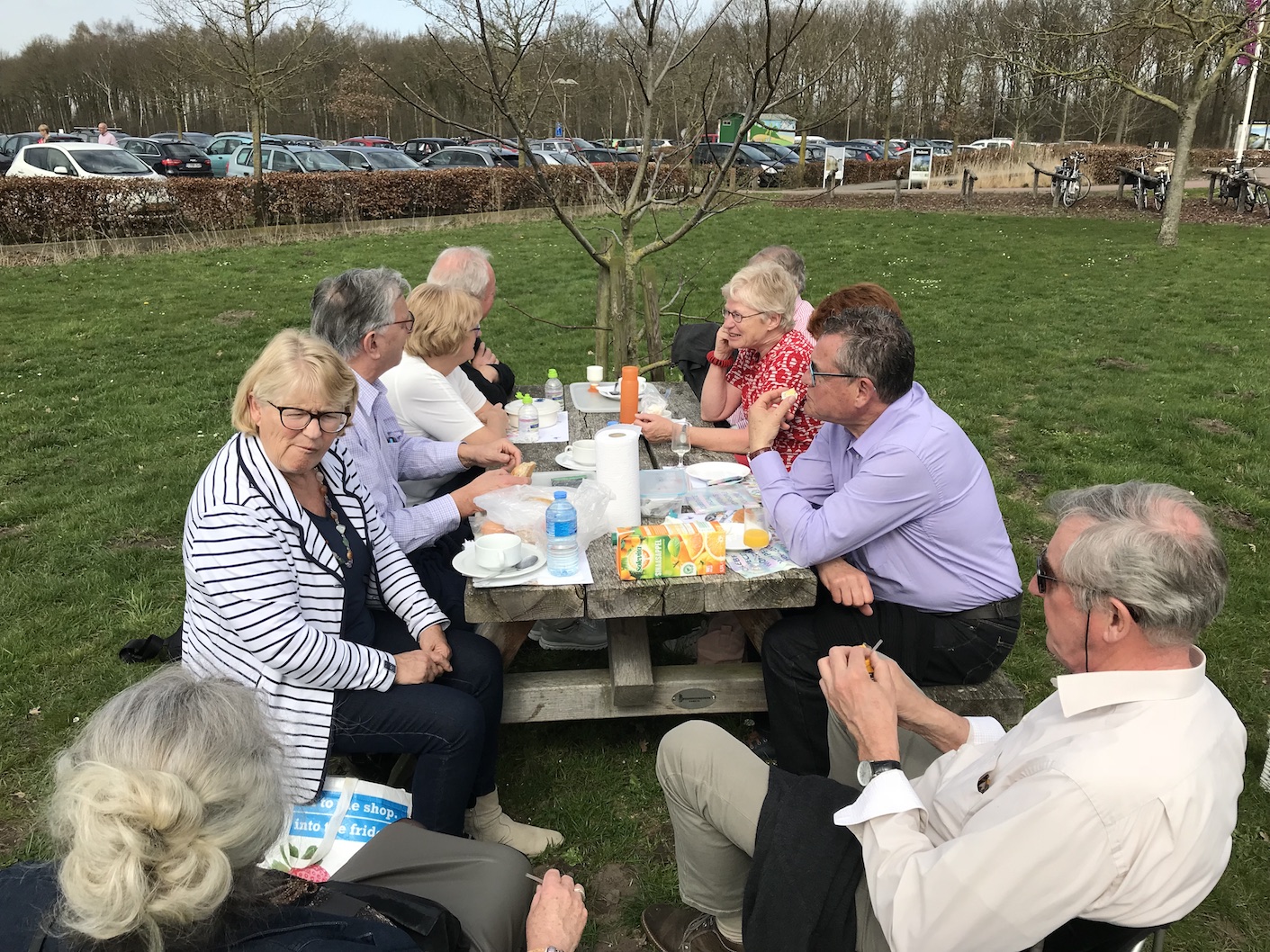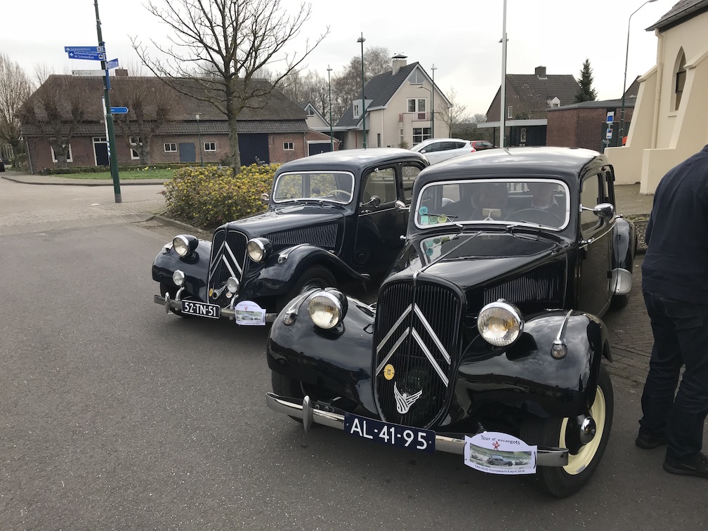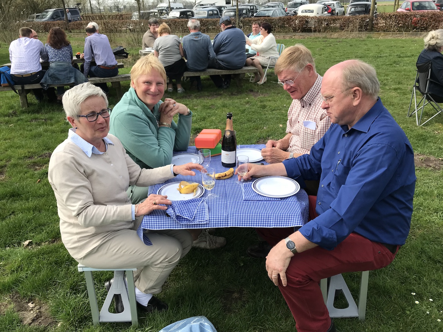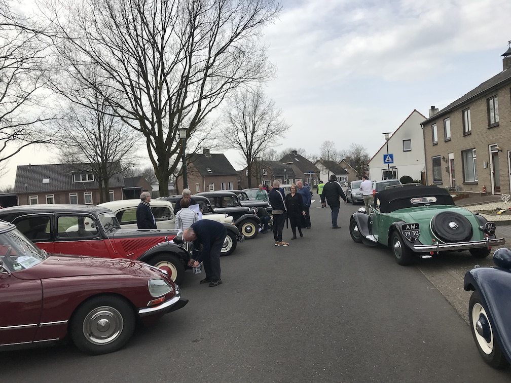 De rit was ook grensverleggend, dat wil zeggen we reden afwisselend door de Nederlandse en Belgische Kempen. Hier en daar kwamen we nog van die oude grenspalen tegen. Het was een prima route, over mooie weggetjes. Op zondagmorgen koersen er veel wielerpelotons in de Kempen, en gingen we af en toe aan de kant voor deze tricotmannen. Dit keer moesten we goed op de kilometerstand letten. Het was hier en daar een beetje puzzelen, maar gelukkig kwamen we met een stralend zonnetje allemaal aan op de picknickplaats. Daar werden we door onze verkeersbegeleiders ontvangen en geparkeerd. Snel werden de picknickmandjes uitgestald, en kon je links uitgebreid de champagne kurken horen ploppen, terwijl rechts het lunchmenu bestond uit bruine bammetjes uit een zakje. Ik vond wel mooi hoe een jochie van een jaar of 5 ons vol bewondering aansprak - “meneer wat voor auto’s zijn dit? Zijn het Citroëns?” Hij bleek het al gezien te hebben aan de strepen in de grille.