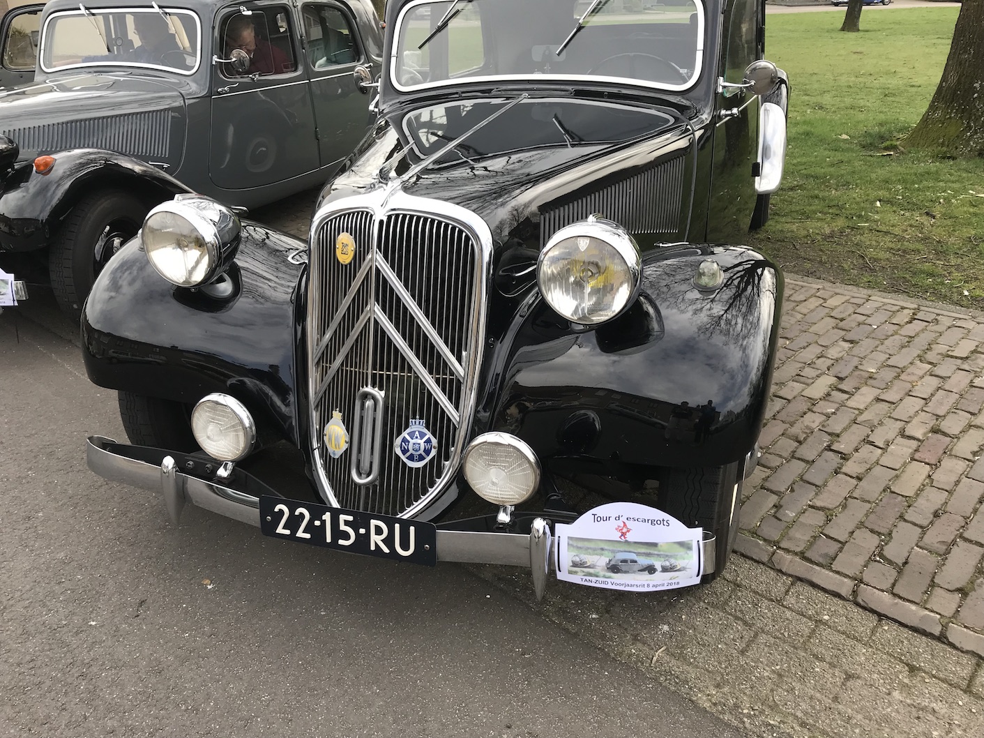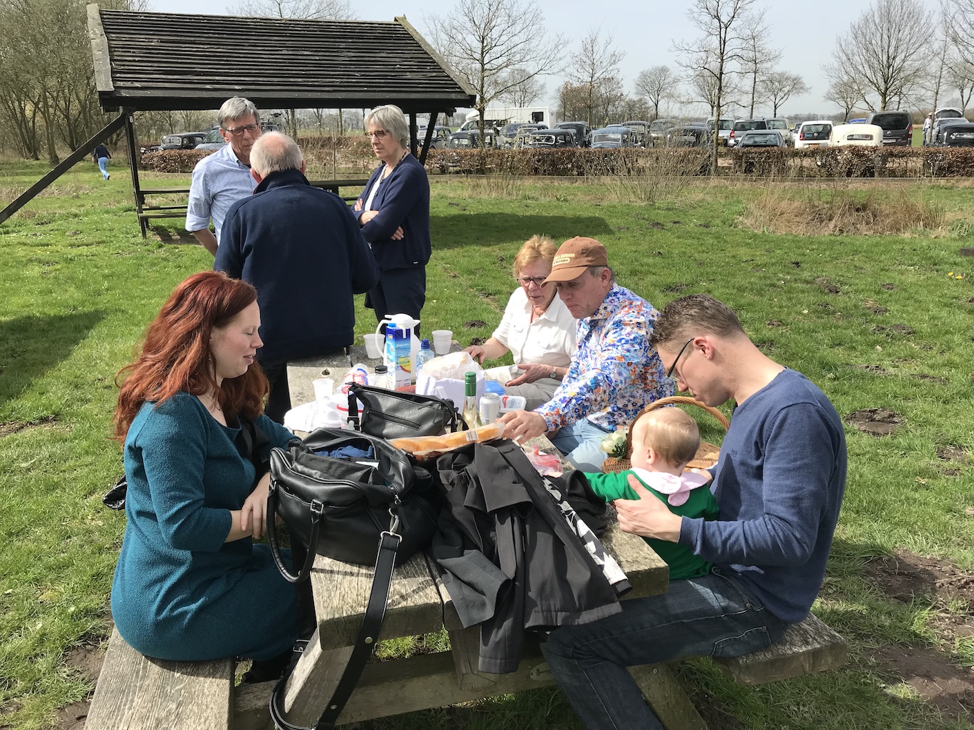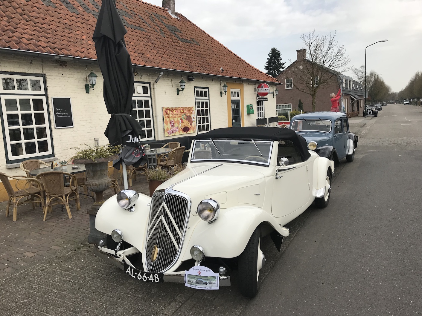 De rit was ook grensverleggend, dat wil zeggen we reden afwisselend door de Nederlandse en Belgische Kempen. Hier en daar kwamen we nog van die oude grenspalen tegen. Het was een prima route, over mooie weggetjes. Op zondagmorgen koersen er veel wielerpelotons in de Kempen, en gingen we af en toe aan de kant voor deze tricotmannen. Dit keer moesten we goed op de kilometerstand letten. Het was hier en daar een beetje puzzelen, maar gelukkig kwamen we met een stralend zonnetje allemaal aan op de picknickplaats. Daar werden we door onze verkeersbegeleiders ontvangen en geparkeerd. Snel werden de picknickmandjes uitgestald, en kon je links uitgebreid de champagne kurken horen ploppen, terwijl rechts het lunchmenu bestond uit bruine bammetjes uit een zakje. Ik vond wel mooi hoe een jochie van een jaar of 5 ons vol bewondering aansprak - “meneer wat voor auto’s zijn dit? Zijn het Citroëns?” Hij bleek het al gezien te hebben aan de strepen in de grille.