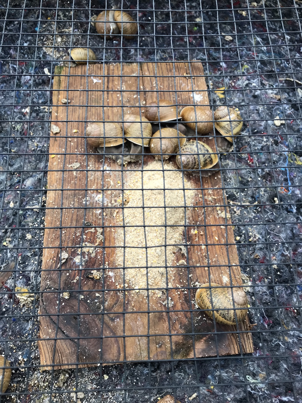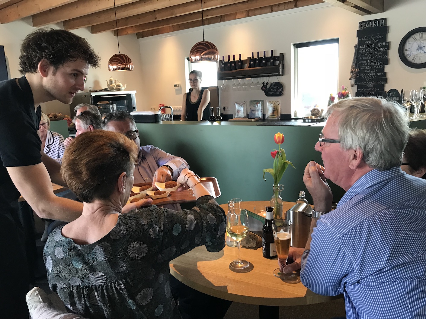 Een uurtje in de stralende zon was mooi, en voldaan gingen we op pad naar kwekerij ’t Slakkenhuys in Ospeldijk. De jonge ondernemer Sjoerd Kessels was 4 jaar geleden gestart als kweker van deze kleverige vriendjes. In Frankrijk zijn nog 25 echte kwekers, en hij had ze allemaal bezocht, om ze honderduit te bevragen en daarna als slakkenboer beslagen ten ijs te komen. We werden eerst in 2 groepen gesplitst. Degenen die al ooit een slak gegeten hadden mochten direct door naar het proeflokaal. Daar kregen ze bij een glaasje witte wijn of fris eerst een heerlijk kroketje met slakken ragout, en daarna een croquille dwz een slakje in bladerdeeg afgeblust met knoflook.