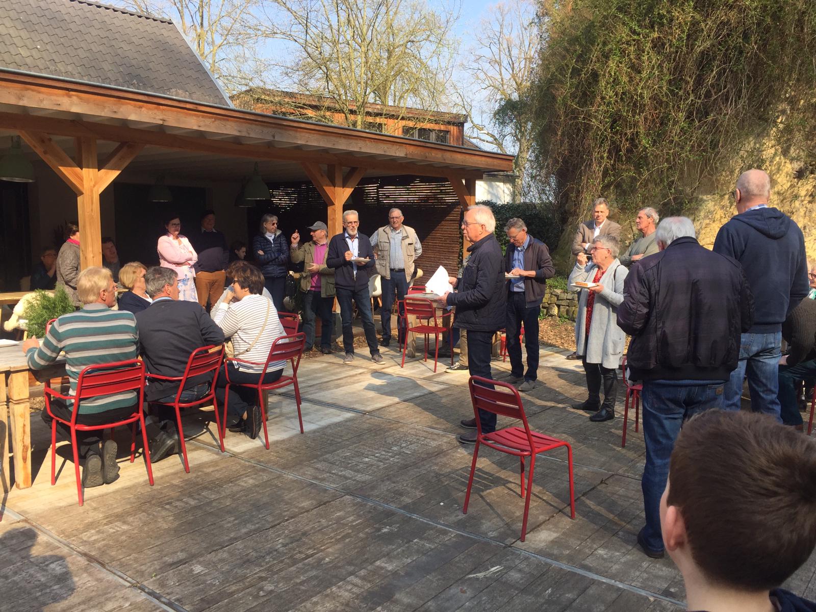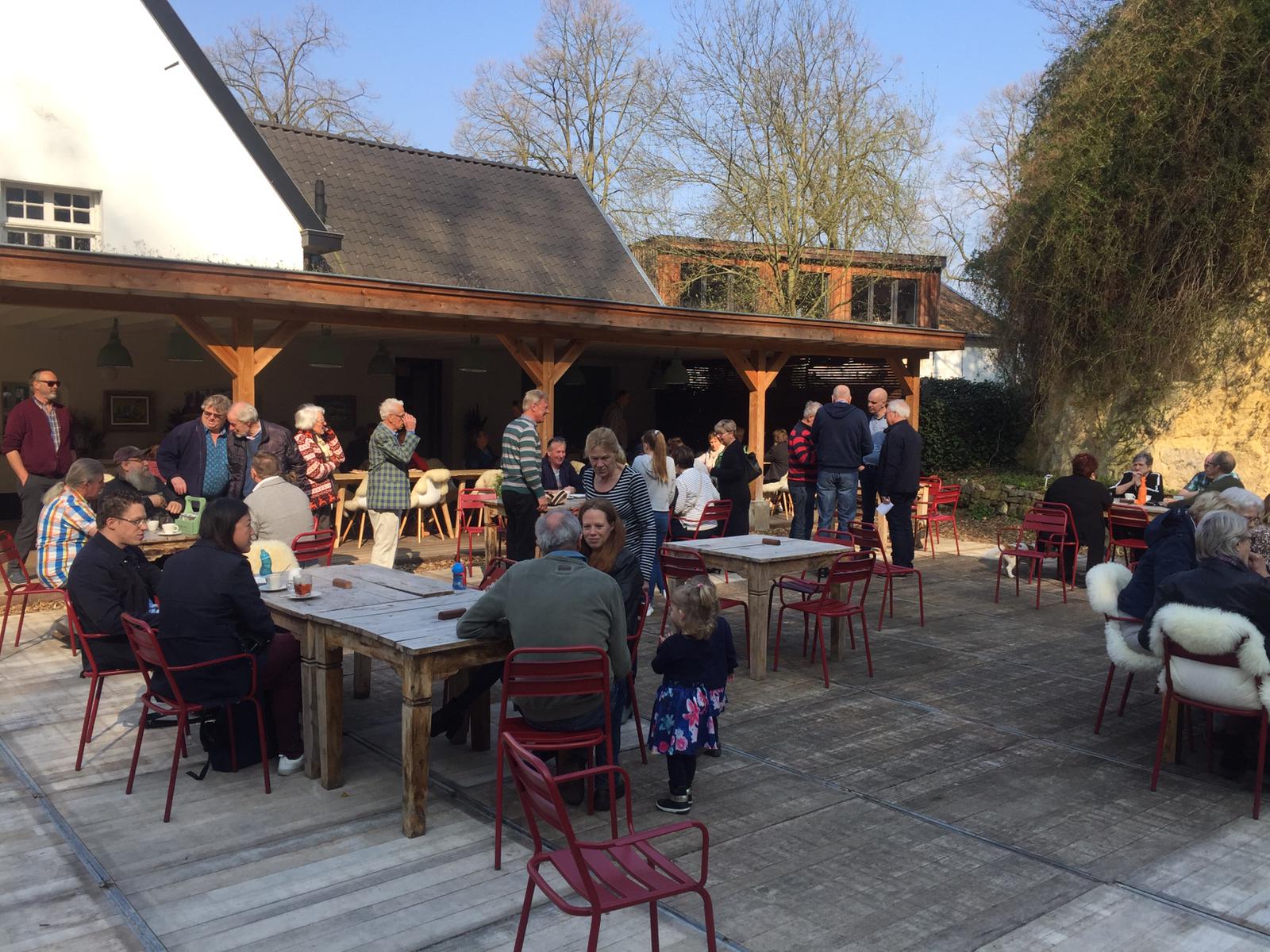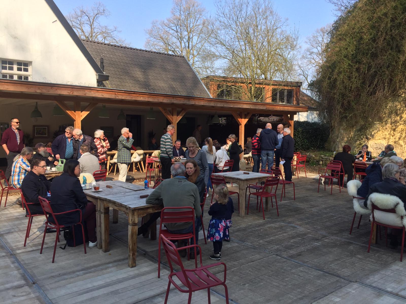 Wat zal de dag gaan brengen. De weersvooruitzichten voor deze dag waren al langer perfect. Dan wil je wel met de “oude dame” toch zeker op pad. Maar dit had niemand kunnen bedenken. Het voorjaar, zeg maar de volle zomer, begin april. We werden door Etienne Ubaghs ontvangen op Landgoed Heerdeberg in Cadier en Keer. Voorin een marktje met streekproducten en delicatessen. Tot oerbrood en schapenvachten toe. Een terras vol met tafels en banken, alles was buiten gedrapeerd. En natuurlijk meteen aan de koffie en Limburgse vlaai. Het woord vlaai al. Heerlijk !