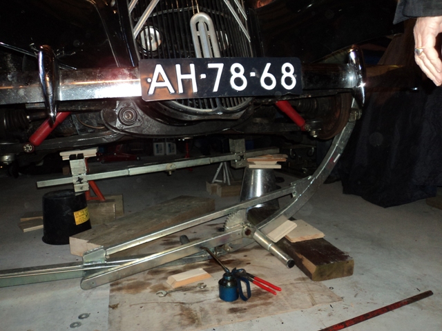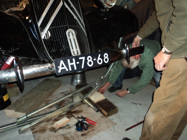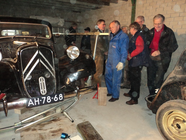 Leo had al de nodige voorbereidingen aan zijn Traction gerealiseerd. De Trax was ontdaan van haar 4 wielen, stond op 4 bokken en een houten constructie (!) te wachten op de montage van een onlangs via Marktplaats gekochte kantel beugel. Doel was de Trax te kantelen en de revisie van de onderzijde van deze dame eens flink aan te pakken. Naast alle onderdelen van deze kantel beugels was er ook een handleiding bijgeleverd. Deze was echter in het Engels , wat voor ons als Francofielen, niet altijd even eenvoudig te volgen was……enfin dat bleek dan ook bij het bevestigen van de beide beugels aan de voor- en achter as. Veel onderling overleg van de ca 20 deelnemers en enkele zeer ijverige handen van onder andere Leo, Huib, Cees, Henk, Bart en Jan resulteerde uiteindelijk in de bevestiging van de beide rol beugels aan de wielschalen van de Trax. Uit ontzag voor het steeds meer wiebelende geheel van de ca 1100 kg wegende dame op haar hoge hakken nam scribent wat meer afstand van het geheel om zodoende een goed overzicht te hebben voor een betrouwbaar verslag als de constructie toch eerder zou kantelen.