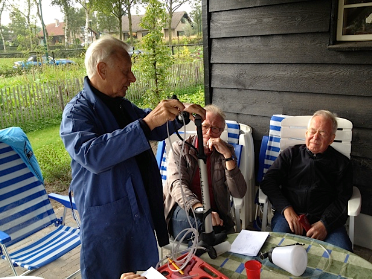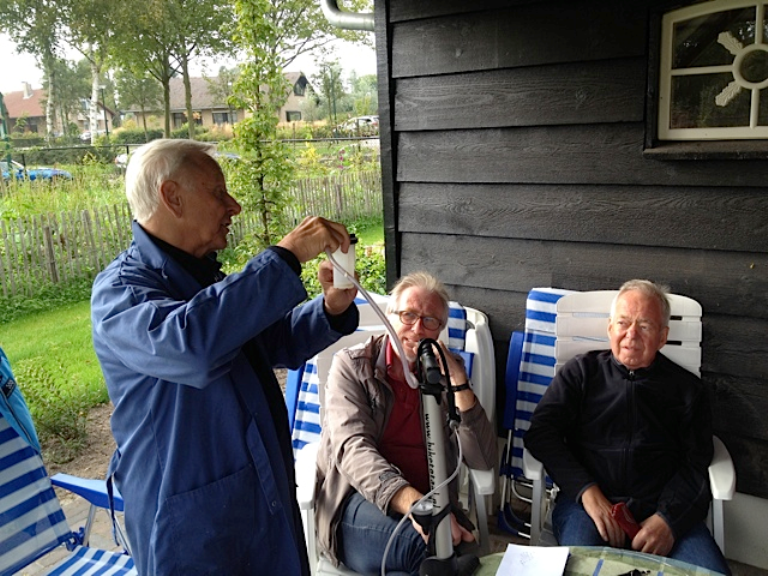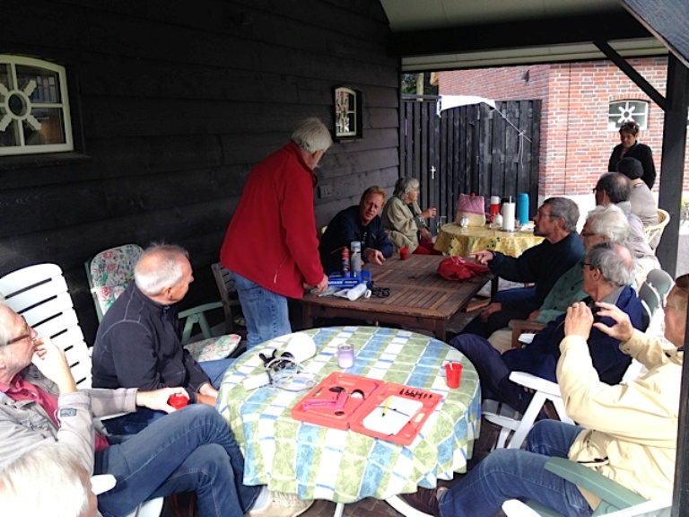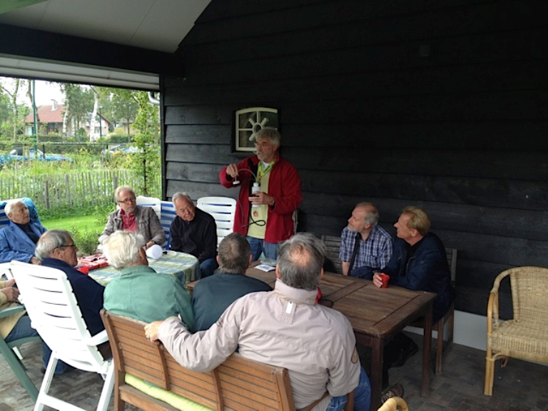 Op het terras gaf Ben ons op zijn onnavolgbare wijze inzicht in de verschillende technieken van het ontluchten van het remsysteem. Daar de toehoorders zo enthousiast meedachten over het onderwerp, moesten zij af en toe even bij de les worden gehouden door de rest. Ben vertelt graag zijn ervaringen op een duidelijke manier en dat wil je maar al te graag bijwonen! Niet alleen remvloeistof maar ook het onderwerp smering kwam aan de orde, iets waar we allemaal baat bij hebben.