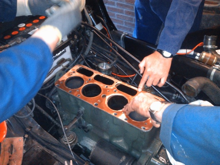 Huib en Henk extra uitgeslapen, goede hulp van Frank Kok met Arendonkse humor, Rene Methorst met onderdelen en velen met goede moed aan het werk. Ik zag vier overalls in, op en onder de Traction, en voordat het tweede kopje koffie genuttigd werd, was de kop eraf (letterlijk en figuurlijk). De kop hing in de gemodificeerde takelinstallatie van Marc en we keken naar de drie plekken waar de koppakking lekte. Na het knikken naar elkaar, de oude pakking eraf en gekeken of de cilinderbussen iets bovenuit staken. Nee dus, maar om de hele motor te demonteren, was geen optie.