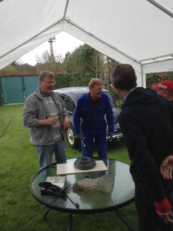 In de periode tot nu toe heeft hij van twee motoren één gemaakt waarbij de nodige onderdelen zijn gereviseerd en vernieuwd. Ook de verschillende onderdelen van de voortrein heeft hij in die periode zodanig onder handen genomen dat ze nu goed konden worden gemonteerd. De Traction hing, in een ruimte die volledig Citroën ademde, in de takels. En de motor stond zodanig praktisch opgesteld dat het werk kon beginnen. Alles was spic en span op orde. Huib en Gaston werden aangewezen als voormannen voor resp. het draaiend krijgen van de motor en het aanbrengen van de volledige voortrein. Zij kregen gelukkig hulp van vele handjes. De startmotor was stuk en moest worden vervangen. Geen probleem, Huib haalde de startmotor uit eigen wagen. Kleppen en ontsteking gesteld en ja hoor om goed 14.00 uur draaide de motor. Een prachtig moment onder applaus begroet. En de voortrein werd ook vakkundig in elkaar gezet. De voorwielophanging, de torsiestaven en hoogtestelling. De verdere opbouw van de voortrein en de afstelling van remvoeringen / remtrommel en uiteindelijk het aanbrengen van de wielen. Vele handjes hebben er toch mooi toe geleid dat de Traction van Paul loopt en weer op zijn pootjes staat. Marieke met hulp van Tho zorgden ondertussen voor de inwendige mens. CHAPEAU.