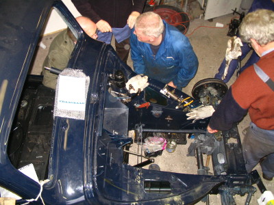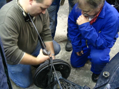 Ploeg Pim ging aan de slag met het linker wiel, en ploeg Frank met het rechtervoorwiel. Ploeg Hans en David was aan de achterkant enthousiast bezig om de boel op te krikken en de remvoeringen te plaatsen.