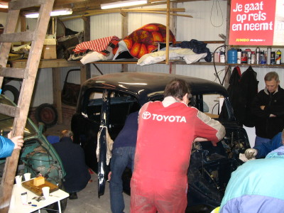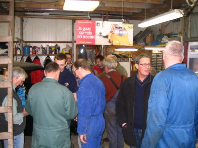 Netjes gespoten en klaar voor het monteren van de remmen. Dus na de koffie en de cake werden de overalls aangetrokken en de wielen opgekrikt. Met grote voortvarendheid werd het werk aangepakt. We waren immers met 16 man en vrouw sterk!