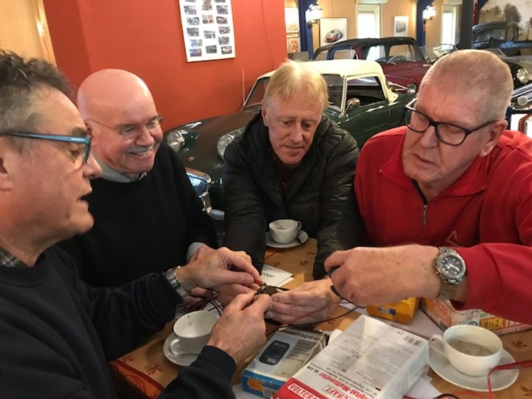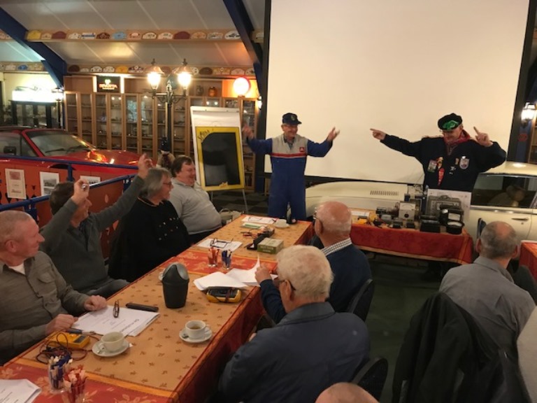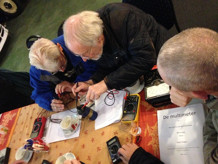 Ook werden, als praktijkoefening, de aanwezigen in groepjes verdeeld om via weerstandmeting te beoordelen wat mis was met voorwerpen als bobine en schakelaars. De resultaten en conclusies van al het gemeet waren redelijk tot goed. We kregen ook de beschikking over een hand-out van de gegeven informatie. Aangevuld met interessante tabellen over stroomwaarden en kabeldikten. Met deze les en hand-out kunnen we nu zelf in de praktijk aan de slag.