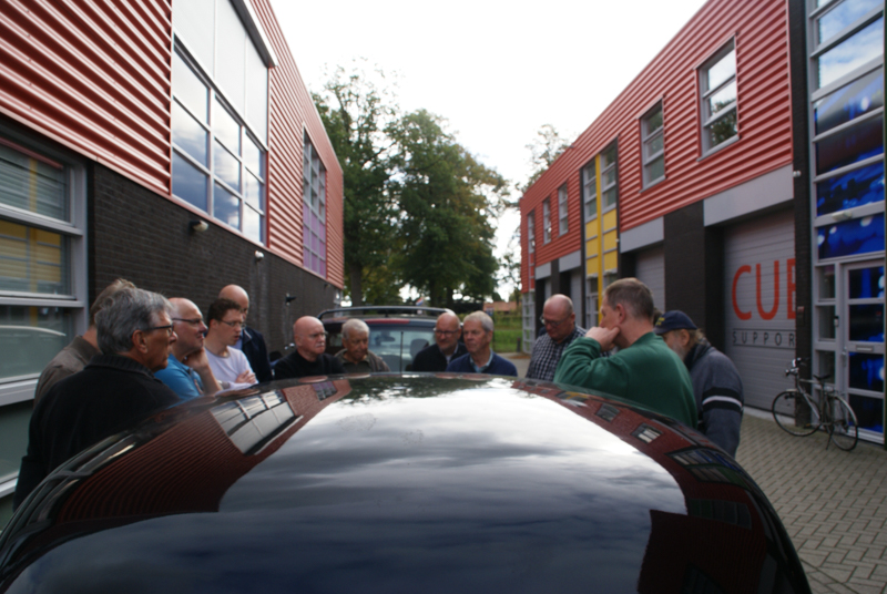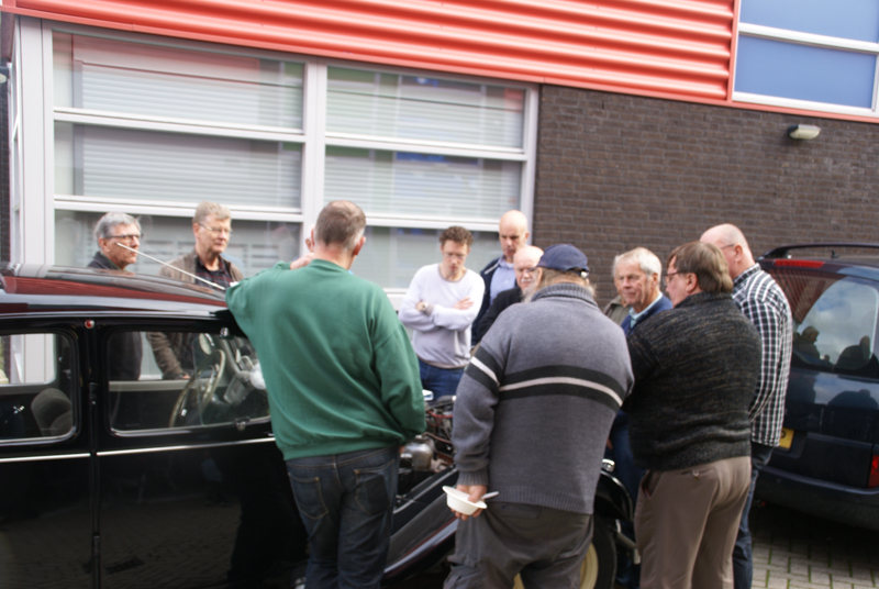 De traction van Ad diende als demo-voertuig en was hiervoor ontdaan van de motorkap, zodat deelnemers ‘zicht’ hadden op de materie. Ben had al een instructie geschreven, maar wilde die eerst in de praktijk toetsen, voordat hij (achteraf) naar de deelnemers wordt verzonden. Het afstellen van de rempedaal is een eitje, maar bij het afstellen van de koppeling moeten een zestal stappen in juiste volgorde worden ondernomen en hierbij ontstond een geanimeerde discussie over het verschil tussen de traditionele drukgroep met drie drukvingers en de moderne diafragma koppeling.