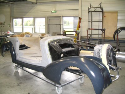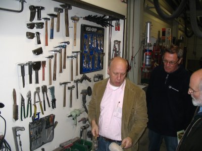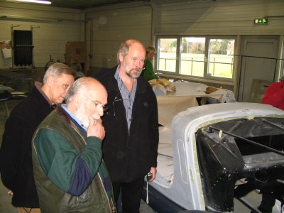 's Middags gingen we naar Grubbenvorst, om daar bij de gebroeders Niessen te kijken naar al het moois dat zij restaureren. We werden hartelijk ontvangen en kregen een rondleiding door het hele bedrijf. Hier worden nog op ambachtelijke wijze oldtimers gerestaureerd. Spatborden van een Aston Martin bijvoorbeeld die worden geklopt uit aluminium met houten hamer op een zandzak. Topstuk dat we konden bezichtigen was een Talbot-Lago T120 uit 1939. Een auto waar maar enkele exemplaren van zijn gemaakt en die helemaal is gestript en weer opgebouwd wordt. Een waar kunstwerkje, waarbij het houtwerk van het frame van de carrosserie nog de meeste hoofdbrekens kostte. Als het meezit gaat deze auto in de zomer van 2008 een mooie prijs winnen op het concours van Pebble Beach in de Verenigde Staten. Aardig detail was ook de versnellingsbak die met pre-select werkt. Je schakelt vast naar de volgende versnelling en via het bedienen de koppeling schakelt de auto pas op of terug.