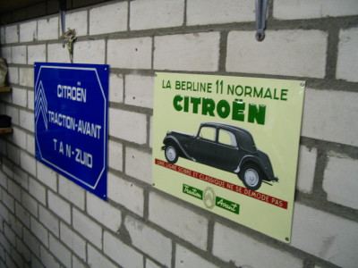 Theo had ook een paar mooie wandversieringen in de garage, zoals een speciaal gemaakt bord met tan-zuid, een oude reclame van de traction en een kalender met een paar dames waarvan eh.. eh... de bekleding nog niet gereed was. In een echte garage mag zoiets natuurlijk niet ontbreken - en met een vleugje Citroën erbij kan het nog net bij dit verslag.