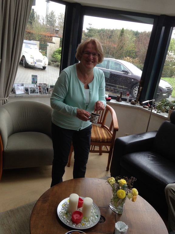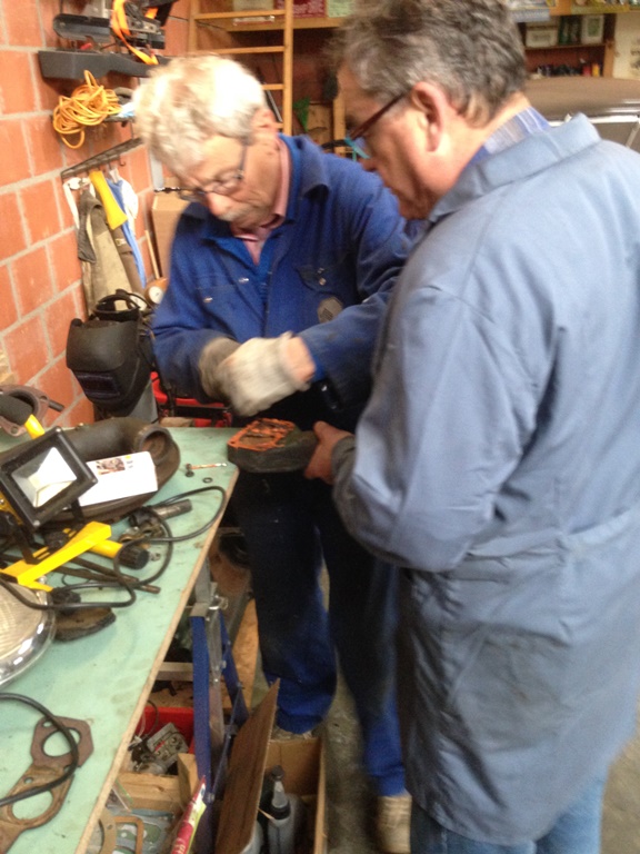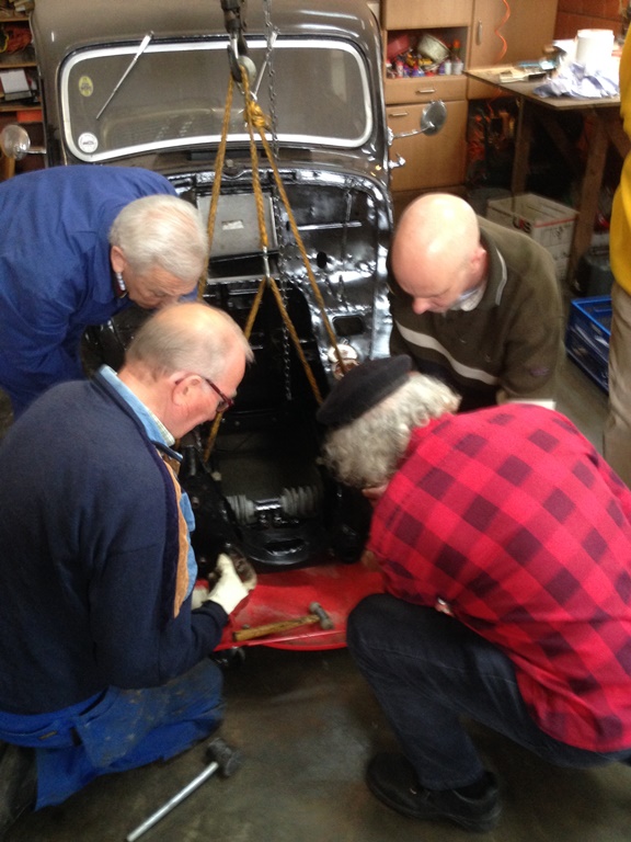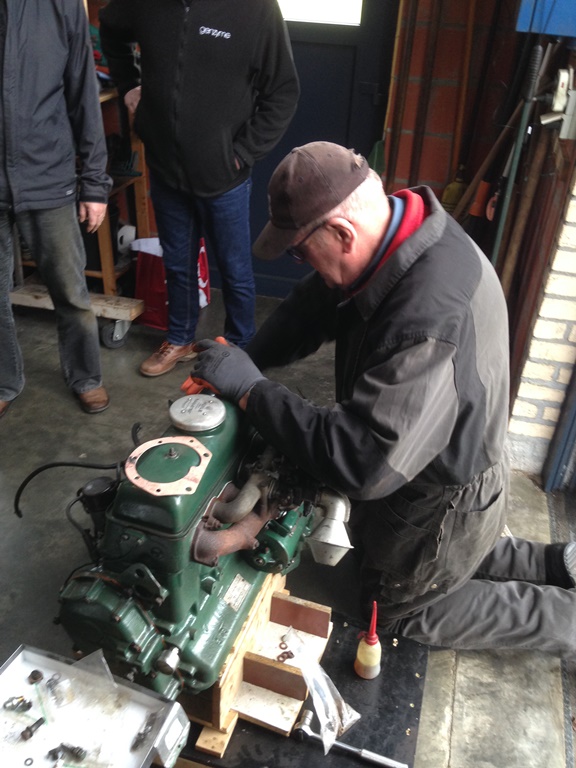 In de periode tot nu toe heeft hij van twee motoren één gemaakt waarbij de nodige onderdelen zijn gereviseerd en vernieuwd. Ook de verschillende onderdelen van de voortrein heeft hij in die periode zodanig onder handen genomen dat ze nu goed konden worden gemonteerd. De Traction hing, in een ruimte die volledig Citroën ademde, in de takels. En de motor stond zodanig praktisch opgesteld dat het werk kon beginnen. Alles was spic en span op orde. Huib en Gaston werden aangewezen als voormannen voor resp. het draaiend krijgen van de motor en het aanbrengen van de volledige voortrein. Zij kregen gelukkig hulp van vele handjes. De startmotor was stuk en moest worden vervangen. Geen probleem, Huib haalde de startmotor uit eigen wagen. Kleppen en ontsteking gesteld en ja hoor om goed 14.00 uur draaide de motor. Een prachtig moment onder applaus begroet. En de voortrein werd ook vakkundig in elkaar gezet. De voorwielophanging, de torsiestaven en hoogtestelling. De verdere opbouw van de voortrein en de afstelling van remvoeringen / remtrommel en uiteindelijk het aanbrengen van de wielen. Vele handjes hebben er toch mooi toe geleid dat de Traction van Paul loopt en weer op zijn pootjes staat. Marieke met hulp van Tho zorgden ondertussen voor de inwendige mens. CHAPEAU.
