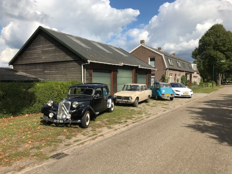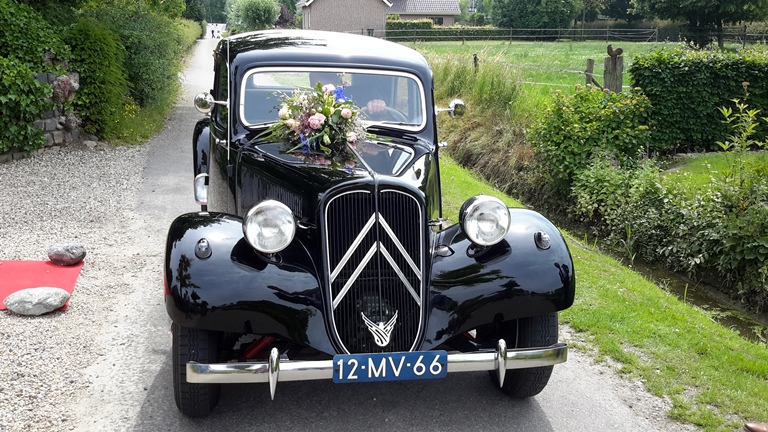 Jan de Haas had als kind van 10 een keer een hele stoet Tractions gezien, en dacht toen: die wil ik later hebben. Hij heeft er regelmatig bij zijn vader aangedrongen, maar dat mocht niet baten. Jan: “Toen ik 45 was besloot ik op zoek te gaan naar een mooie Traction. Mijn zus kende iemand die vroeger een Traction garage had, en die man heeft met mij deze auto gevonden bij het taxibedrijf”. De Traction had hier en daar wel wat butsen opgelopen en Jan heeft dat allemaal weer prachtig hersteld. Ook van de aandrijving, remmen en motor heeft hij het nodige gereviseerd. Tot slot heeft Jan een oude man gevonden die vroeger autobekleder was, en die heeft de Traction weer schitterend bekleed. Als het zomers mooi weer is, neemt Jan de Traction en rijdt door de mooie Betuwe fluitend naar zijn werk. De auto zal in zijn hele leven inmiddels wel meer dan 2 ton hebben gelopen schatten Noud en Jan. Overigens stamt echtgenote Jennie ook uit een Citroën familie, haar vader was concessionaire van het merk, en ze had vroeger een Eend. En jullie raden al wat het volgende project van Jan is: een Eend restaureren, we zagen hem al in zijn garage staan. Jennie: “Twee jaar geleden trouwde ons buurmeisje, en het was voor Jan een hele eer om dit lieve bruidspaar te mogen rijden. In juni van dit jaar volgden mijn zoon en schoondochter, en in augustus trouwden mijn dochter en schoonzoon. Prachtige ritten met de Traction, mooi opgepoetst en tiptop in orde!
