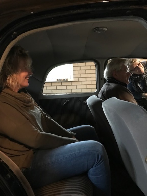 Op een regenachtige zaterdag werden we met een warm welkom ontvangen door Jan en Jennie en hun dochter. Het eerste plechtige moment was de overhandiging van de map met alle aantekeningen en aankoopbewijzen die Noud nog had bewaard. Jan was er maar wat blij mee, dat hij deze historie nu kan inzien. Het tweede mooie moment was het betreden van de garage. De auto is in concours staat en het moment van weerzien voor Noud, Joke en Janneke was fantastisch. Al gauw ging de motorkap open, en werd er plaats genomen in de auto. Alles voelde weer als vanouds, zelfs de sticker op de achterruit zat er nog op. Meteen kwamen er nog meer herinneringen naar boven, en konden Noud en Jan alle technische aanpassingen doornemen die ze hadden gedaan. Ik denk dat er op een mooie voorjaarsdag er nog een leuk ritje wordt gemaakt door deze 2 heren in de prachtige Betuwe.
