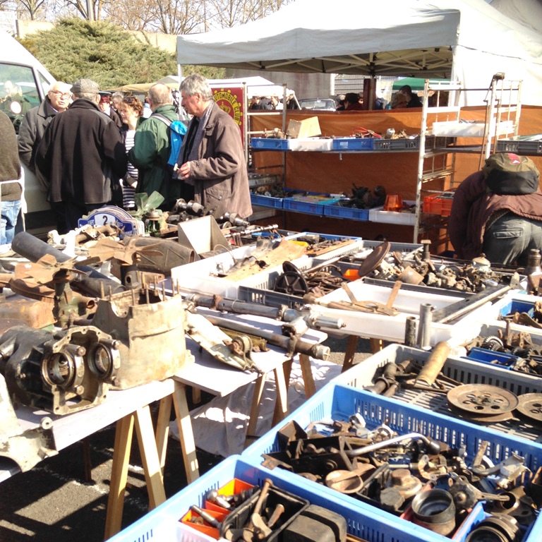 Op het voorterrein van de expositiehallen hadden de handelaren, in grote getallen, aanwezig in stalletjes, kramen en/of gewoon op de grond hun artikelen uitgespreid. Hier was de trend dat voor onderdelen van de Traxion, de DS, fietsen, bromfietsen/motoren, 2 CV een goed aanbod was. In feite is het teveel voor een dag. Zeker als je gericht onderdelen wilt zoeken. Ook handig was dat Paul en Bart de Franse taal goed beheersen, want anders wordt het moeilijk onderhalen. Ook de prijzen verschilden veel. De gereviseerde carburateur werd van 225 tot 100 euro aangeboden. Moeilijke keuze? Een schakelaar vroeg men met veel gemak 25 euro terwijl deze voor 4 euro uiteindelijk in mijn zak belandde.
