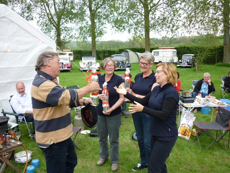 Woensdag was het al gezellig druk op de fantastische (kleine) camping des Trois Pays in Licques (Pas de Calais). Catherine et Denis Lance hadden als eigenaren een speciaal veld voor TAN vrijgemaakt, waar de Tractions, caravans en tenten in een grote kring konden staan met middenin de partytenten. Versieringen met afdelingvlaggen en lampen maakten het compleet. De welkomstborrel kon donderdag meteen van start, waarbij de ervaringen van de heenreis uitgewisseld werden. Geen echte problemen met de voitures; buiten een uitgelopen motorlager (dan toch maar de luxe wagen opgehaald), geoxideerd contact van een startschakelaar, een niet ladende dynamo en wat afstellingen waren de werkzaamheden op het TAN-veld.