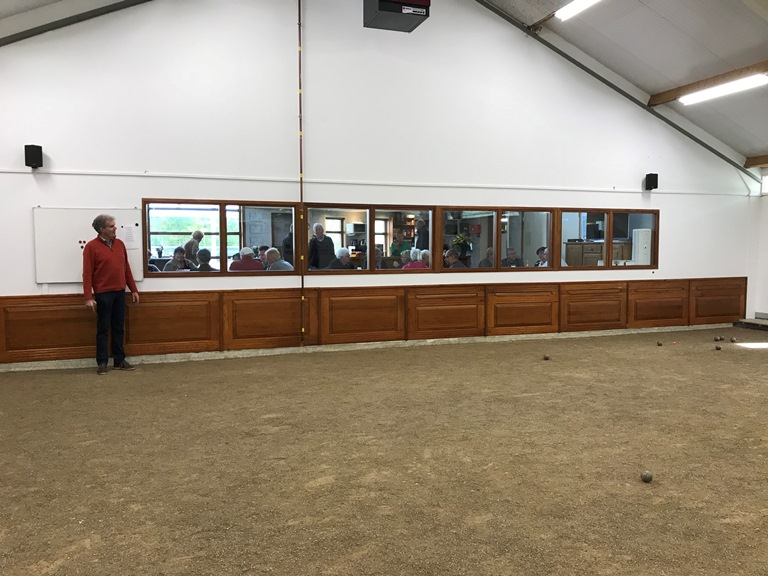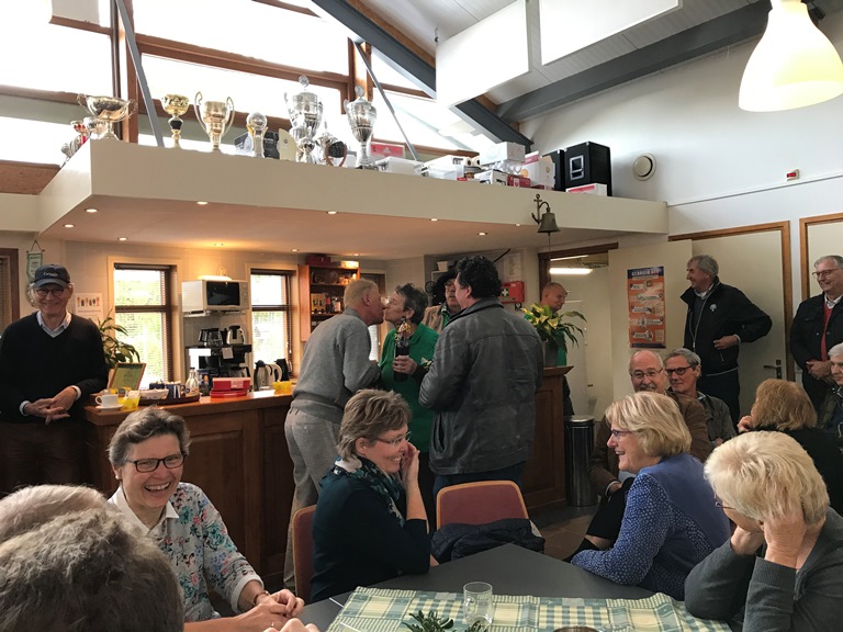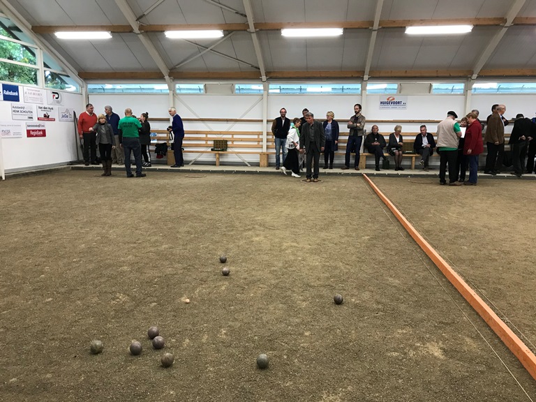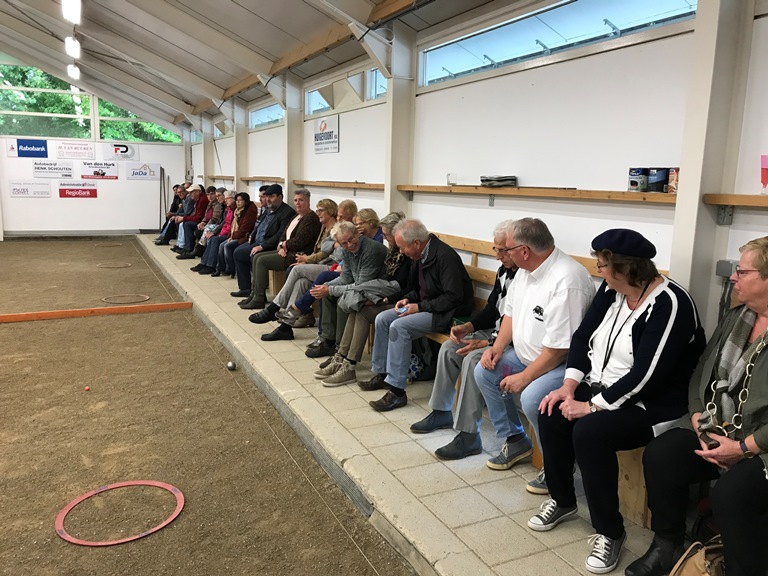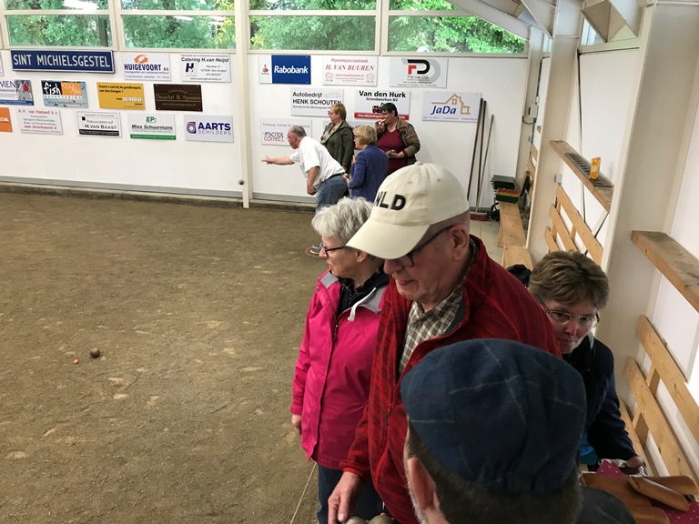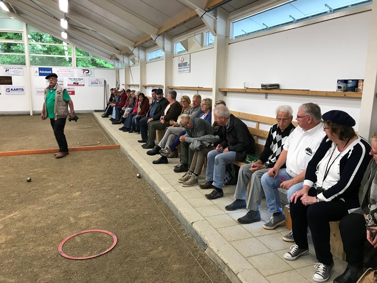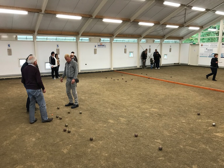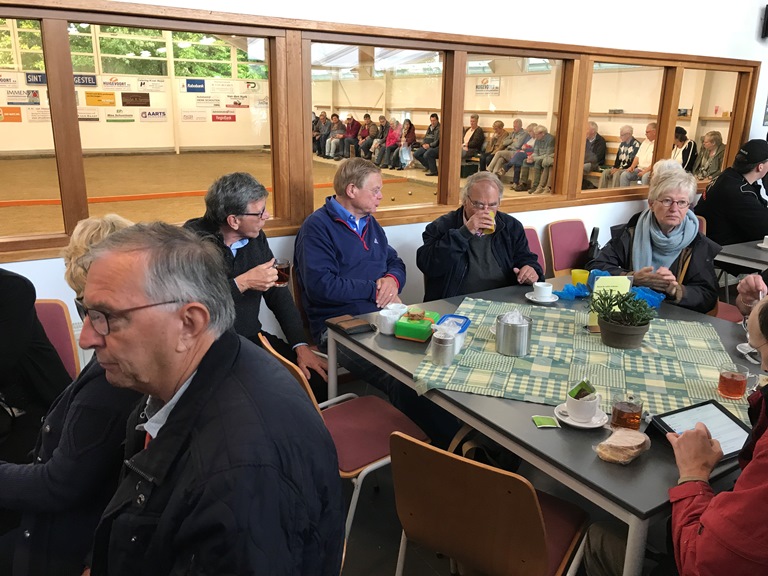 De voorspelling van Jan Uijlings dat we een mooie route zouden volgen, werd zeker niet gelogenstraft. Zelfs de vele Brabanders die deelnamen, kwamen in ook voor hen onbekende dreven en weggetjes. Zoals later ook werd gememoreerd, was het een leuke bijkomstigheid van het weer dat we weinig last hadden van wandelaars en fietsers op de weg. Uiteindelijk kwamen we aan bij ’t Dupke in Sint Michelsgestel, waar een sportieve tussenstop was gepland. Onder leiding van de organisatie, letterlijk en figuurlijk met de franse slag, werd iedereen naar de mooie, ruime overdekt petanquebanen gedirigeerd. Een leuke manier om met andere deelnemers samen gezellig bezig te zijn. En zowaar er waren ook nog deelnemers die dankzij hun partners gewonnen hadden en die mochten een collectors item, een fles wijn met ’t Dupke etiket in ontvangst nemen tijdens een enigszins chaotische maar zeker geen onplezierige prijsuitreiking.