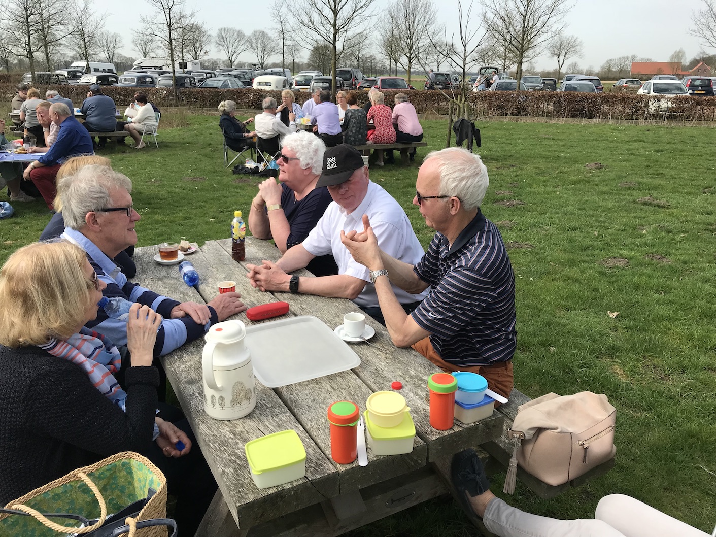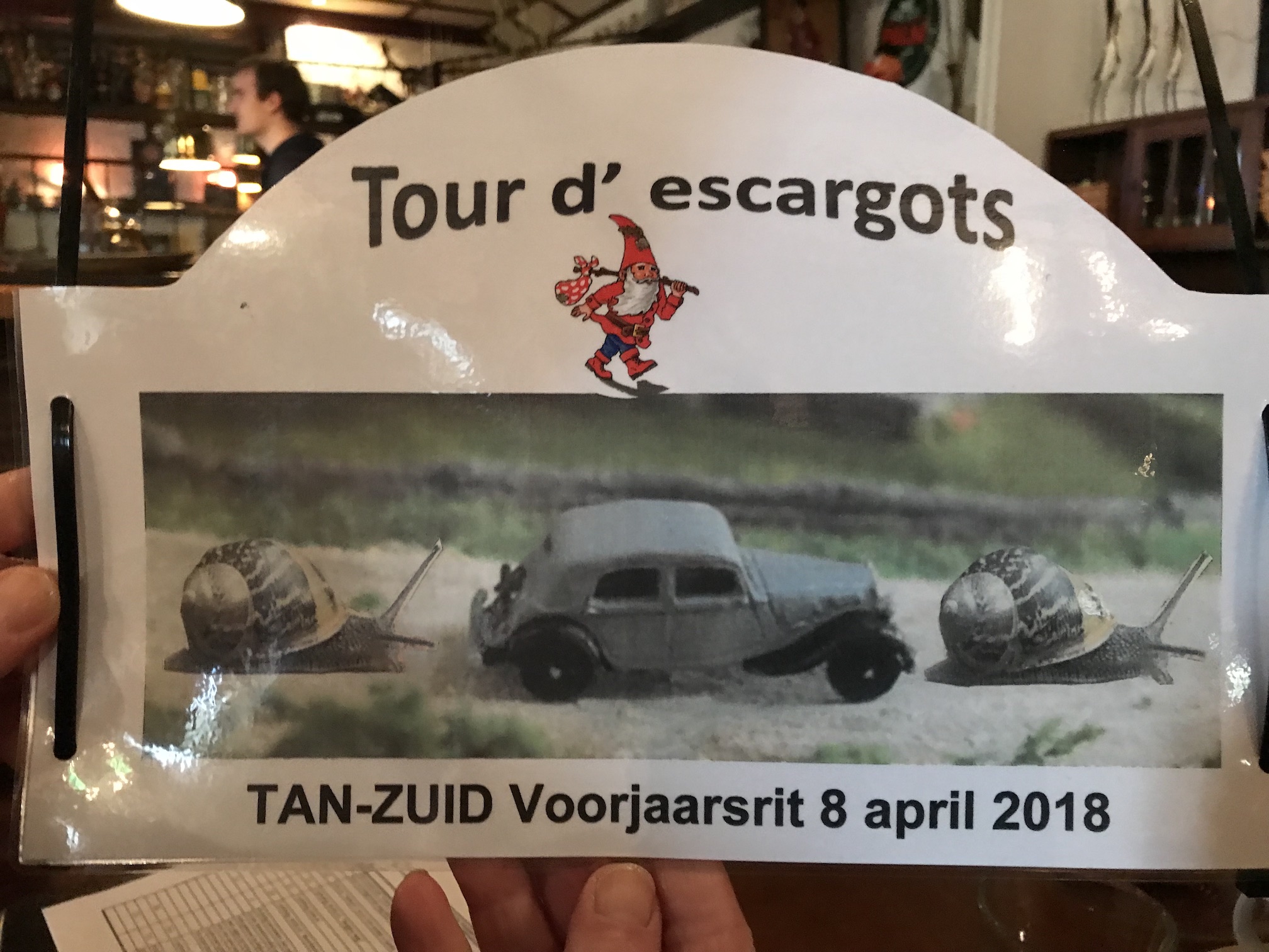 De rit was ook grensverleggend, dat wil zeggen we reden afwisselend door de Nederlandse en Belgische Kempen. Hier en daar kwamen we nog van die oude grenspalen tegen. Het was een prima route, over mooie weggetjes. Op zondagmorgen koersen er veel wielerpelotons in de Kempen, en gingen we af en toe aan de kant voor deze tricotmannen. Dit keer moesten we goed op de kilometerstand letten. Het was hier en daar een beetje puzzelen, maar gelukkig kwamen we met een stralend zonnetje allemaal aan op de picknickplaats. Daar werden we door onze verkeersbegeleiders ontvangen en geparkeerd. Snel werden de picknickmandjes uitgestald, en kon je links uitgebreid de champagne kurken horen ploppen, terwijl rechts het lunchmenu bestond uit bruine bammetjes uit een zakje. Ik vond wel mooi hoe een jochie van een jaar of 5 ons vol bewondering aansprak - “meneer wat voor auto’s zijn dit? Zijn het Citroëns?” Hij bleek het al gezien te hebben aan de strepen in de grille.