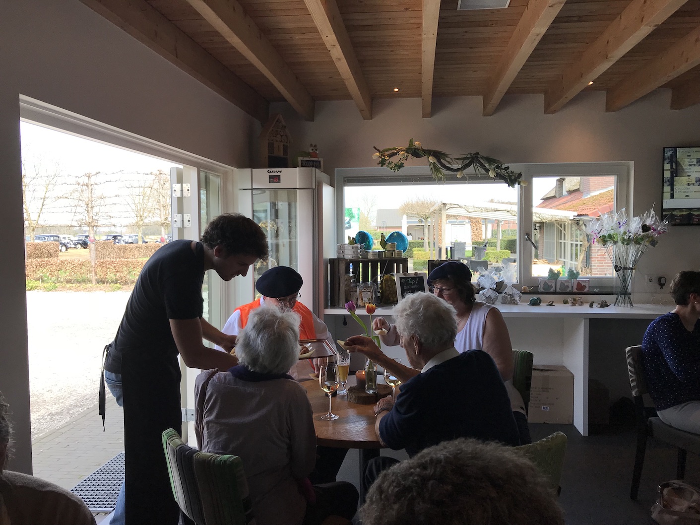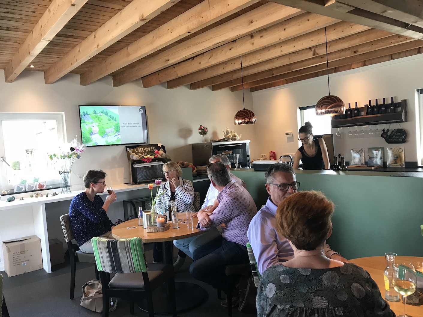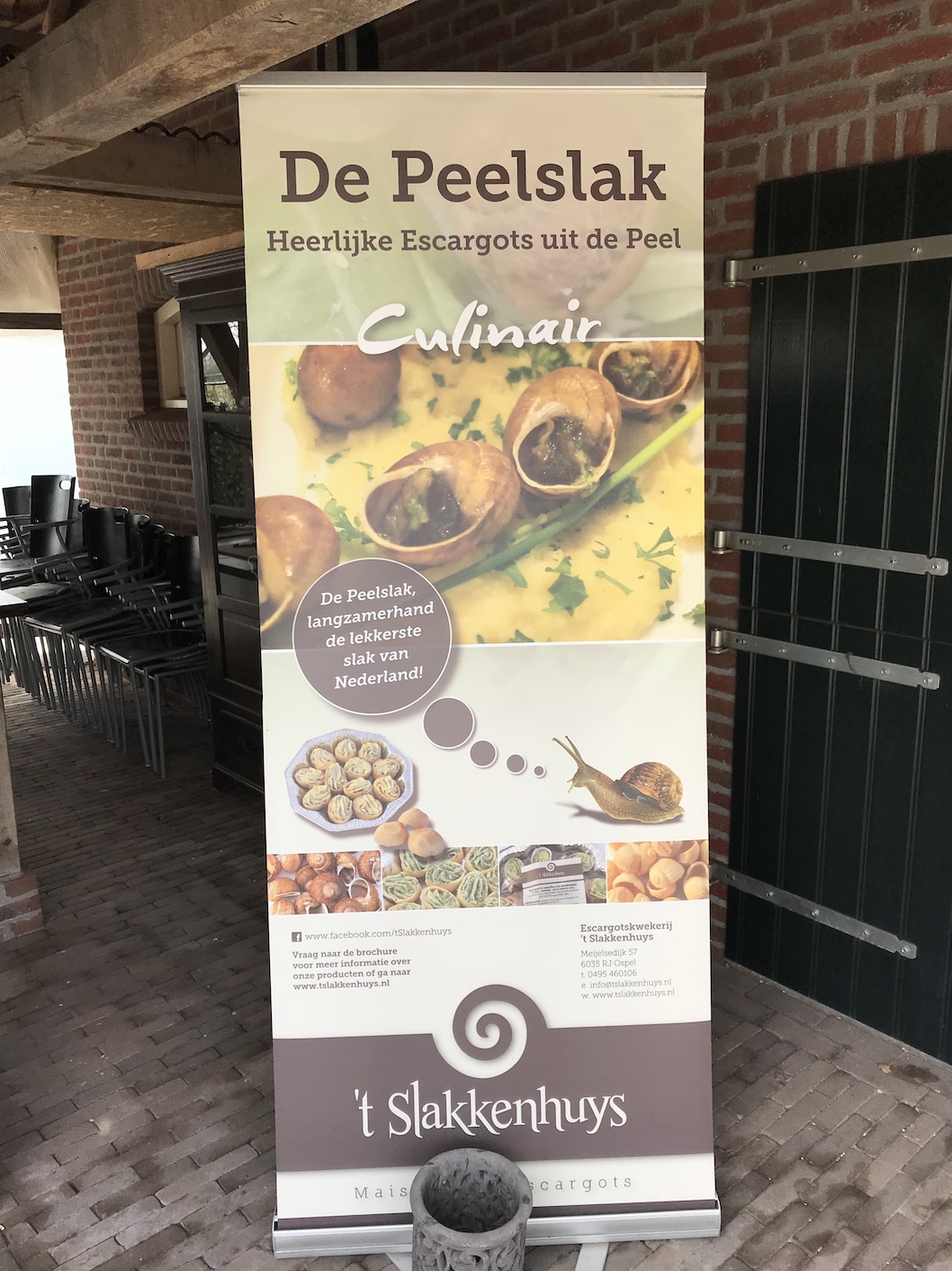 Ik behoorde tot de groep die zijn slakkendoop nog moest krijgen, en dus werden wij tactisch eerst de kas in geleid door Sjoerd. Hij vertelde een uitstekend verhaal over hoe hij de beestjes in een fokprogramma heeft opgenomen. De romantiek van de slak bestaat uit het vinden van een leuke partner en dan schiet ie een pijltje met feromonen (geurstof) uit zijn nek. Op slag verliefd, als een echte cupido. Vervolgens blijven ze heerlijk een dagje aan elkaar kleven, waarna ze eitjes leggen. De boer kweekt deze eitjes op tot volwassen slakken. Er kruipen jaarlijks 200.000 rond in zijn kas. Vervolgens belanden ze in de keuken waar ze diervriendelijk worden ontdaan van ingewanden en voorbereid voor de horeca. Na dit uitgebreide verhaal gingen wij ter tafel en konden wij onze tanden in dit mooie en smakelijke product zetten. Iemand gaf ons de tip - denk aan een champignon - en ik moet zeggen, ja dat was een goed idee!