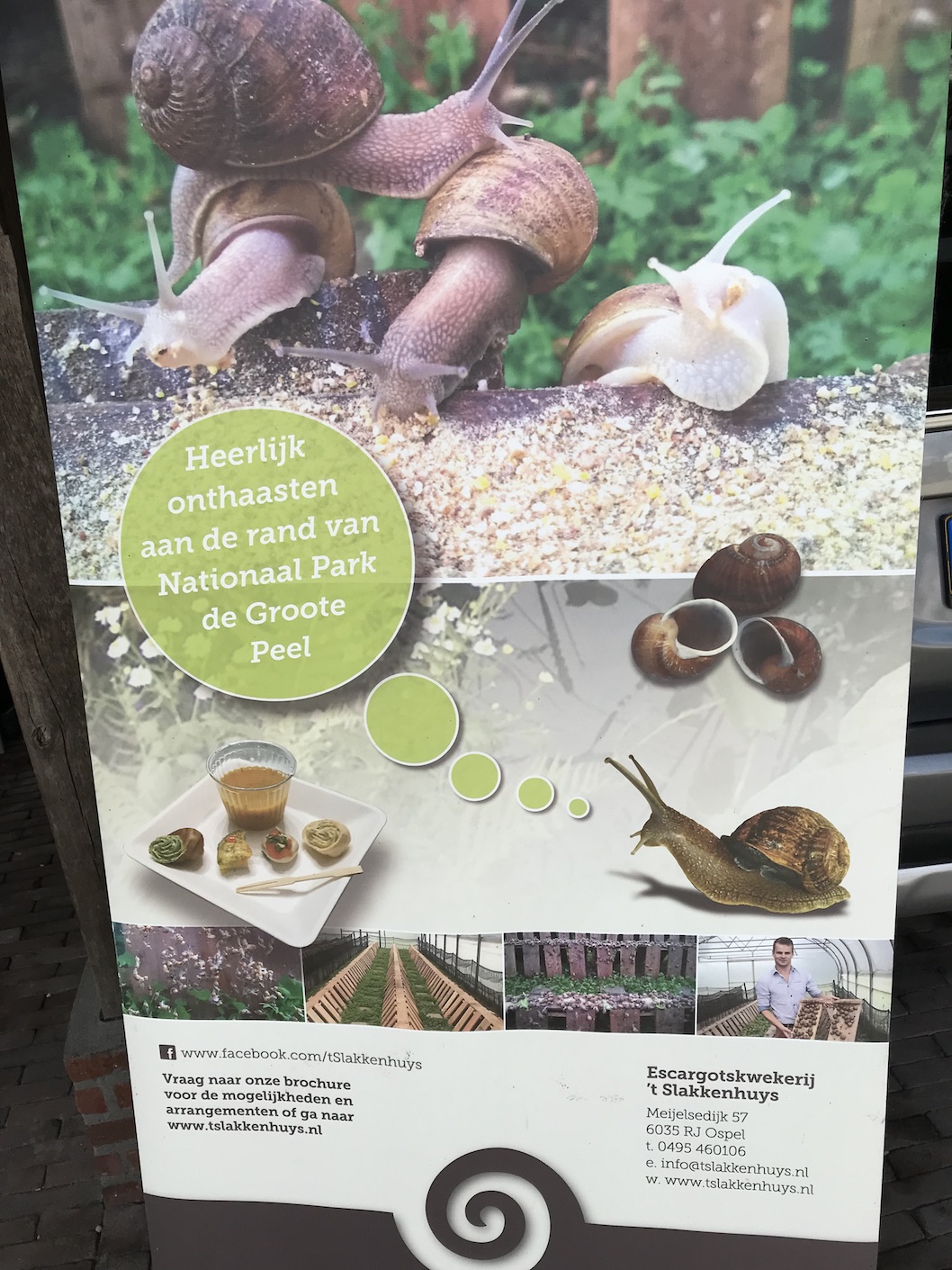 Een uurtje in de stralende zon was mooi, en voldaan gingen we op pad naar kwekerij ’t Slakkenhuys in Ospeldijk. De jonge ondernemer Sjoerd Kessels was 4 jaar geleden gestart als kweker van deze kleverige vriendjes. In Frankrijk zijn nog 25 echte kwekers, en hij had ze allemaal bezocht, om ze honderduit te bevragen en daarna als slakkenboer beslagen ten ijs te komen. We werden eerst in 2 groepen gesplitst. Degenen die al ooit een slak gegeten hadden mochten direct door naar het proeflokaal. Daar kregen ze bij een glaasje witte wijn of fris eerst een heerlijk kroketje met slakken ragout, en daarna een croquille dwz een slakje in bladerdeeg afgeblust met knoflook.