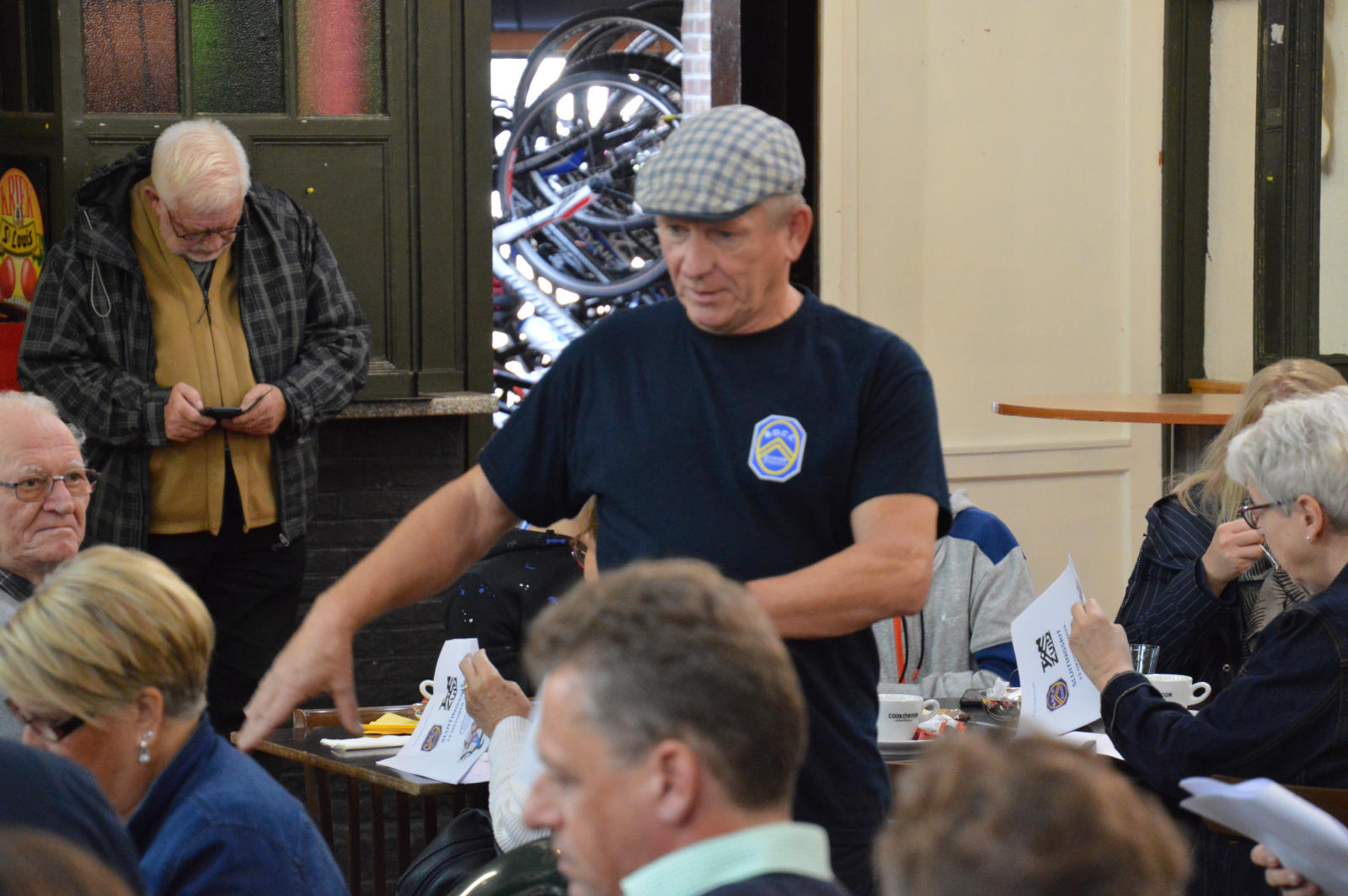 De ritmeester Marc van Zundert legde ons kort uit wat en hoe de route gereden kon worden aan de hand van een handzame routebeschrijving. Het weer werkte wonderbaarlijk mee en dus togen de dames in al haar schakeringen de weg op. Het was af en toe lastiger als het leek en menigeen kwam elkaar weer eens uit tegenovergestelde richting tegen. Na een uitvoerige zwerftocht van ruim 60 km door het gebied van nood België, zochten we een pleisterplaats op in Rijkevorsel. Een verbouwde grote hal die ingericht was met een draaiorgel en een voor België zo typische inrichting. Een band was zich aan het voorbereiden, want in de namiddag was er de gelegenheid om te dansen. Dit neemt niet weg dat er enkele koppels, waaronder fam. Schipper, een optreden gaven in stijl dansen. Na een lekker drankje vertrok de stoet voor de laatste rit van 40 km naar het eindpunt in de Smaakhoeve te Merksplas