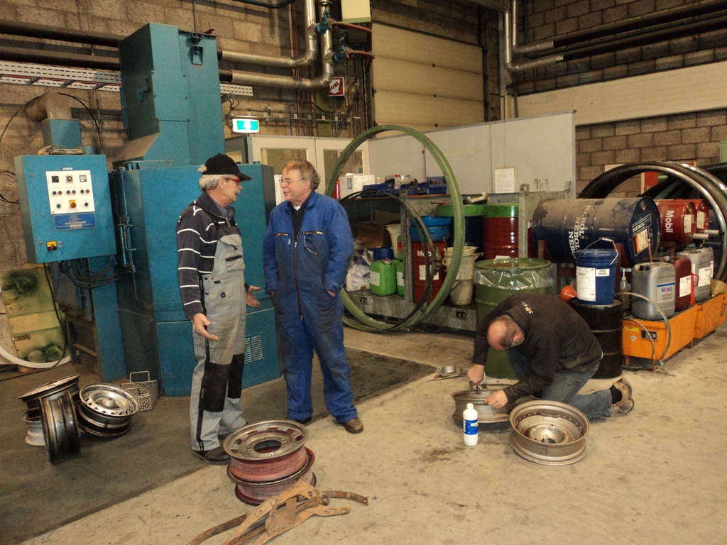 Glimmend en weer als nieuw konden aan het eind van de middag de vele velgen, schermsteunen, spruitstukken, grilles, maar ook vele andere onderdelen van onze Tractions bewonderd worden. Natuurlijk moest Huib, als ware meester op de computer gestuurde machines, een tweetal krukassen weer helemaal op de juiste verhouding uitbalanceren; een kunst die maar weinig leden op dit niveau Huib nadoen!