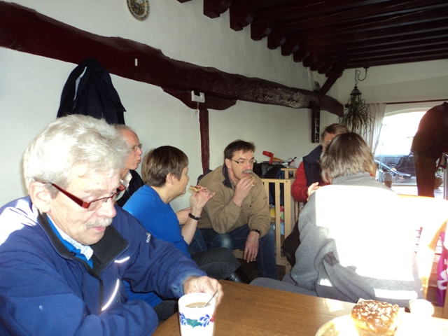 Welaan tijd voor de lunch, tijd voor de heerlijke soep van echtgenote Lotte, tijd voor het bedanken van de gastvrouw en -heer en vooral tijd voor wat bezinning hoe de constructie toch het beste zou kunnen worden afgemaakt ….want beheerst kantelen van de statige dame zou het doel van onze sleutelbijeenkomst toch zijn. Huib vond echter al vanaf het begin van het samenstellen van de hevel , dat de bevestiging van de auto aan de beugel op een veel te hoge afstand was gemaakt; afbreken van alles wat we in de morgen hadden gedaan was het devies! En weer werd onder het begeleidend commentaar van vele en door het werk van enkele ijverigen, maar nu op een uitstekende wijze, de beugels op een stabiele manier bevestigd aan de voor- en achter as.